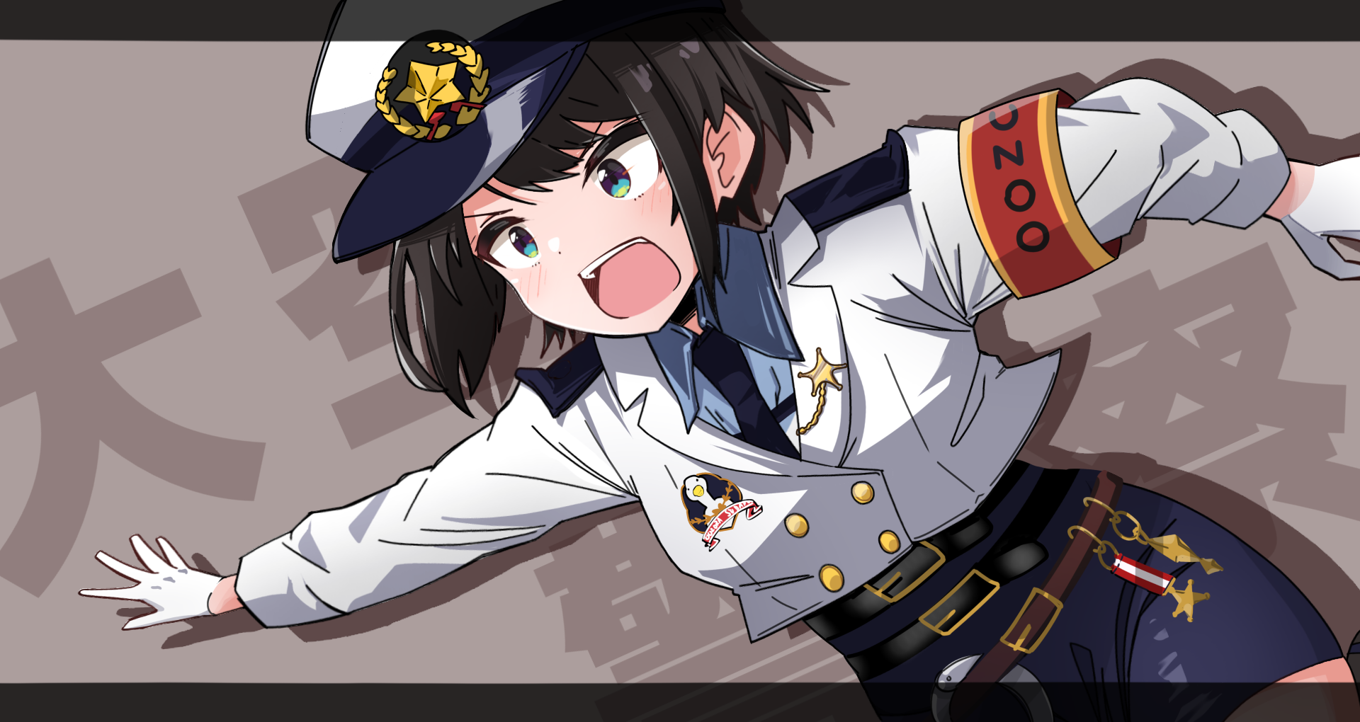 1girl angry armband black_hair black_necktie black_skirt blue_eyes blue_shirt blush brown_background buttons character_name collared_shirt cropped_jacket double-breasted gloves gold_buttons hat high-waist_skirt highres hololive jacket kei_lr letterboxed long_sleeves necktie official_alternate_costume oozora_subaru oozora_subaru_(police) open_mouth peaked_cap pencil_skirt police police_hat police_uniform policewoman shirt short_hair skirt solo swept_bangs v-shaped_eyebrows virtual_youtuber white_gloves white_hat white_jacket