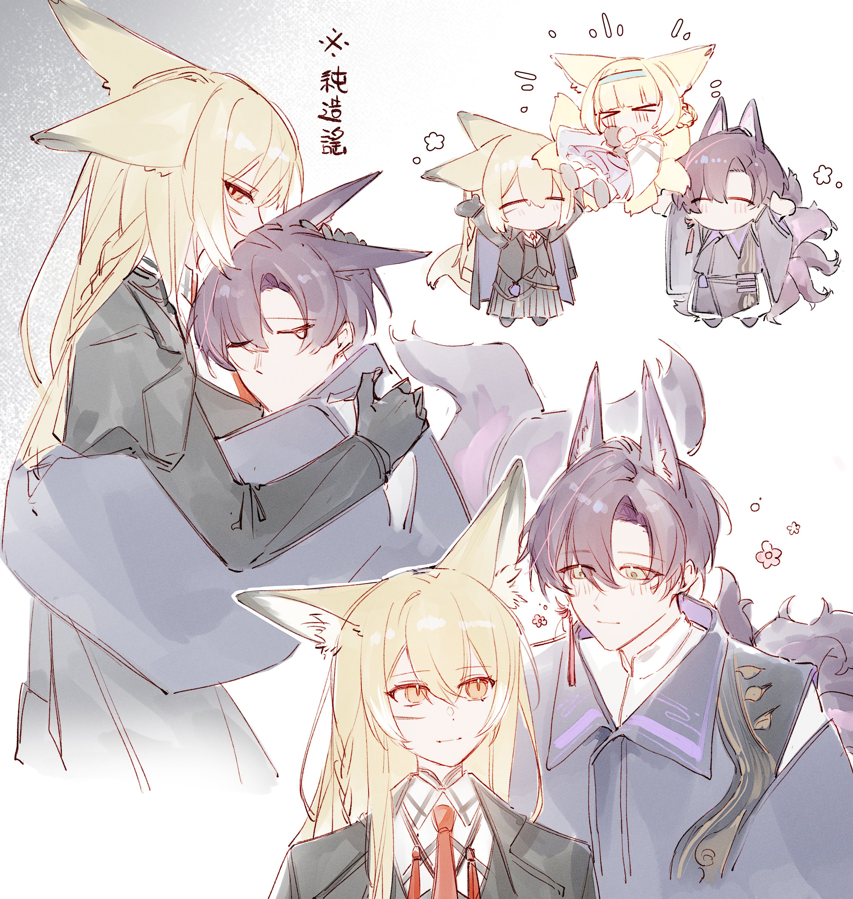 1boy 2girls absurdres animal_ears arknights blonde_hair closed_eyes commentary family father_and_child father_and_daughter fox_boy fox_ears fox_girl fox_tail green_eyes hashtag-only_commentary highres japanese_clothes kitsune kyuubi mother_and_child mother_and_daughter mucha_1232 multiple_girls multiple_tails orange_eyes parent_and_child suzuran's_father_(arknights) suzuran_(arknights) tail translation_request vulpisfoglia_(arknights)