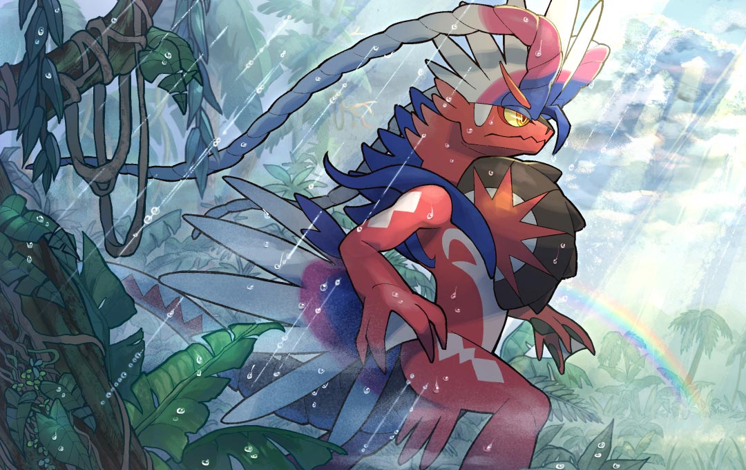 artist_request closed_mouth cloud cloudy_sky colored_sclera dripping koraidon leaf nintendo no_humans orange_eyes outdoors palm_tree plant pokemon pokemon_(creature) pokemon_focus pokemon_tcg rain rainbow second-party_source sky solo standing tree vines wet yellow_sclera