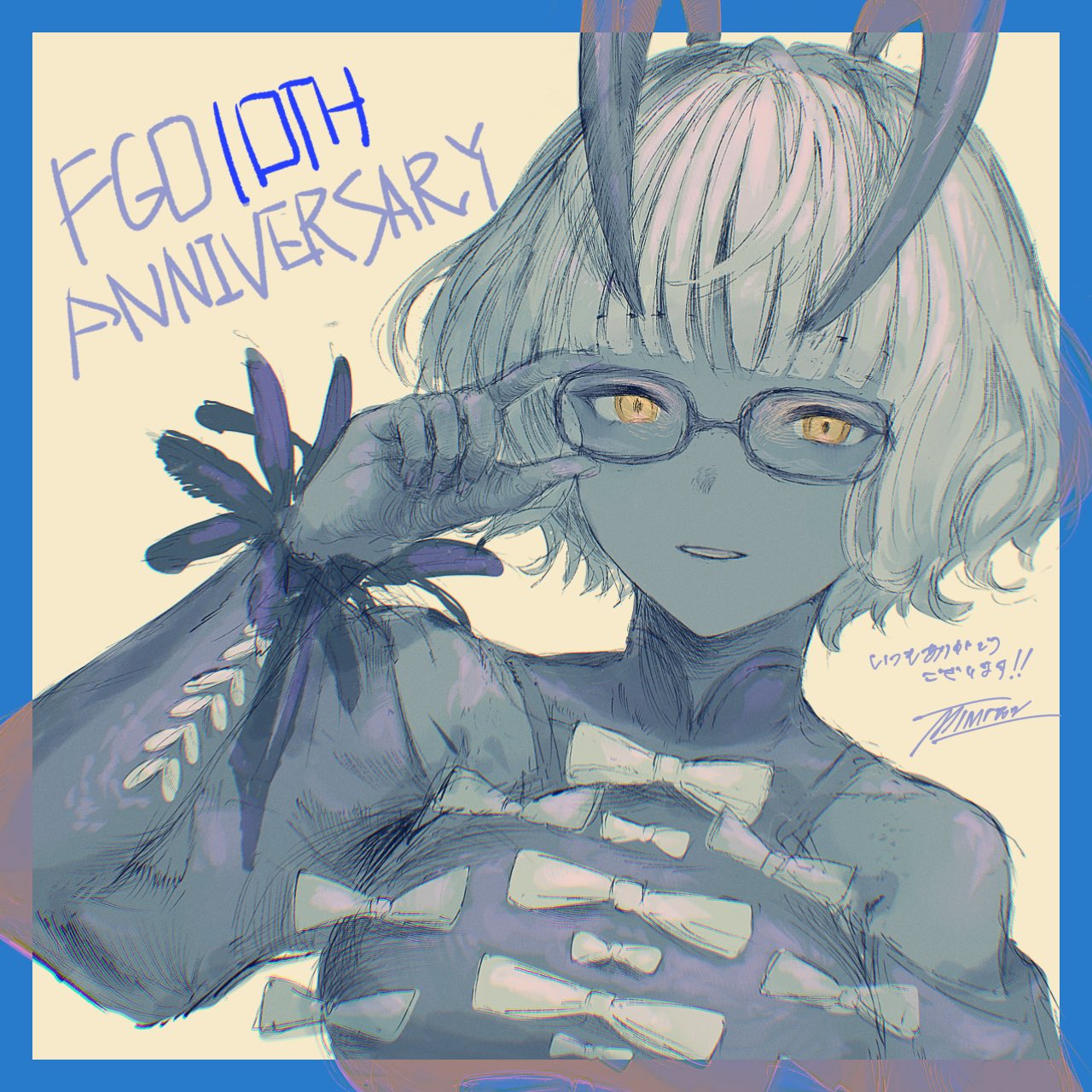 1girl adjusting_eyewear anniversary bow breasts colored_skin dark-skinned_female dark_skin demon_girl demon_horns fate/grand_order fate_(series) glasses grey_hair grey_skin highres horns jacques_de_molay_(celebratory_attire)_(fate) jacques_de_molay_(foreigner)_(fate) long_sleeves miton_(vvse5752) open_mouth short_hair simple_background smile solo upper_body yellow_background yellow_eyes