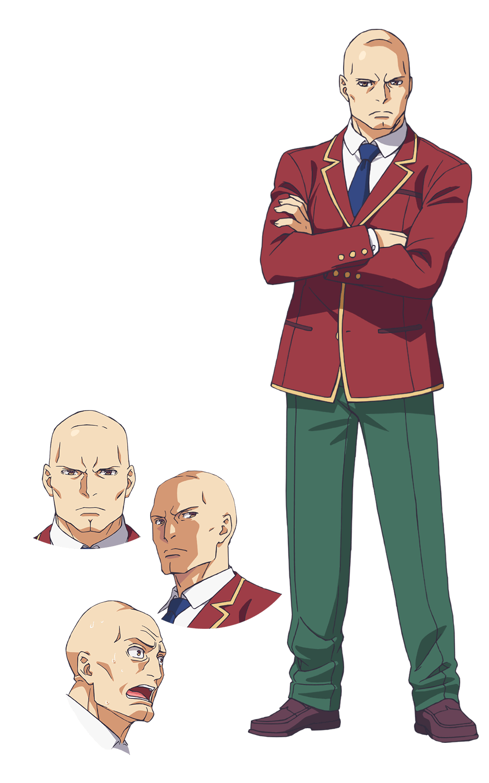 4boys advanced_nurturing_high_school_uniform anime_coloring bald blazer blue_necktie brown_eyes cleft_chin closed_mouth collared_shirt crossed_arms dress_shoes full_body green_pants highres jacket katsuragi_kouhei long_sleeves looking_at_viewer morita_kazuaki multiple_boys multiple_views necktie official_art open_mouth pants red_jacket school_uniform shirt simple_background standing teeth transparent_background upper_body white_shirt youkoso_jitsuryoku_shijou_shugi_no_kyoushitsu_e
