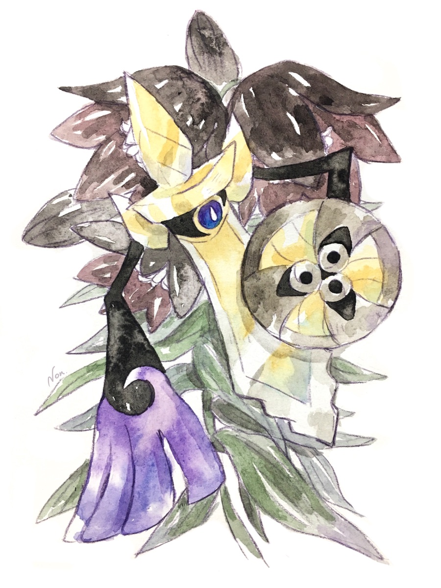 aegislash black_flower blue_eyes flower full_body gen_6_pokemon highres kamchatka_lily nintendo no_humans non_(kumakawayusu) painting_(medium) pokemon pokemon_(creature) signature simple_background solo sword traditional_media watercolor_(medium) weapon white_background