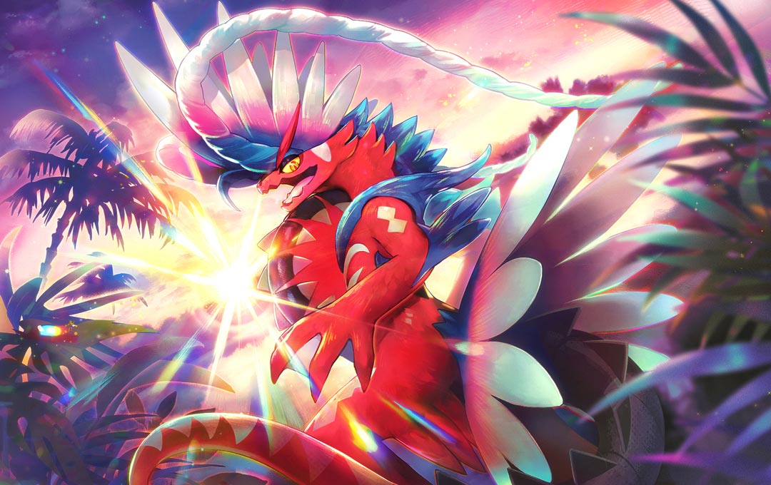 artist_request check_artist cloud colored_sclera koraidon lens_flare nintendo no_humans open_mouth orange_eyes palm_tree pokemon pokemon_(creature) pokemon_focus pokemon_tcg second-party_source shutsuri sky solo sun tree yellow_sclera