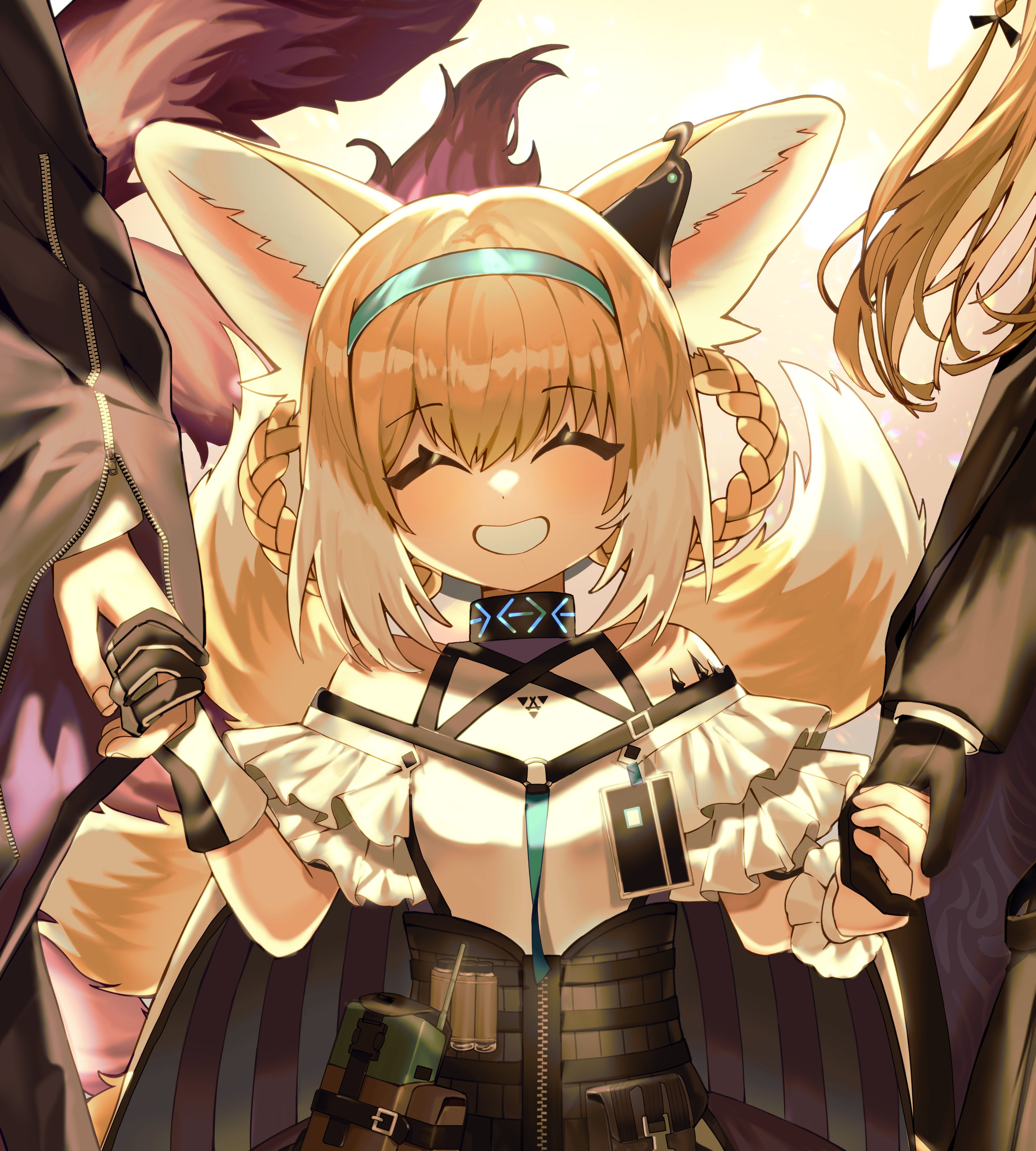 1boy 2girls ^_^ absurdres animal_ears arknights bare_shoulders black_gloves blonde_hair blue_hairband braid braided_hair_rings closed_eyes comiclove1314 earpiece family father_and_child father_and_daughter fox_ears fox_girl fox_tail gloves hair_rings hairband highres holding_hands infection_monitor_(arknights) kitsune kyuubi material_growth mother_and_child mother_and_daughter multiple_girls multiple_tails oripathy_lesion_(arknights) parent_and_child parted_lips short_hair single_glove smile suzuran's_father_(arknights) suzuran_(arknights) tail teeth twin_braids vulpisfoglia_(arknights)