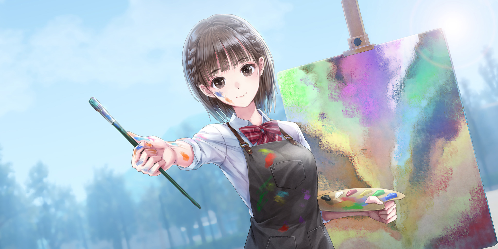 1girl apron blue_reflection_(series) blue_reflection_sun blue_sky bow braid breasts brown_eyes brown_hair clenched_hand closed_mouth day dutch_angle easel game_cg green_apron highres holding holding_paint_palette holding_paintbrush hoshiya_kanna kishida_mel looking_at_viewer medium_breasts non-web_source official_art outdoors outstretched_arm paint_on_clothes paint_on_hands paint_palette paint_splatter paint_splatter_on_face paintbrush plaid_bow red_bow school_uniform self-datamine shirt short_hair sky smile solo twin_braids white_shirt