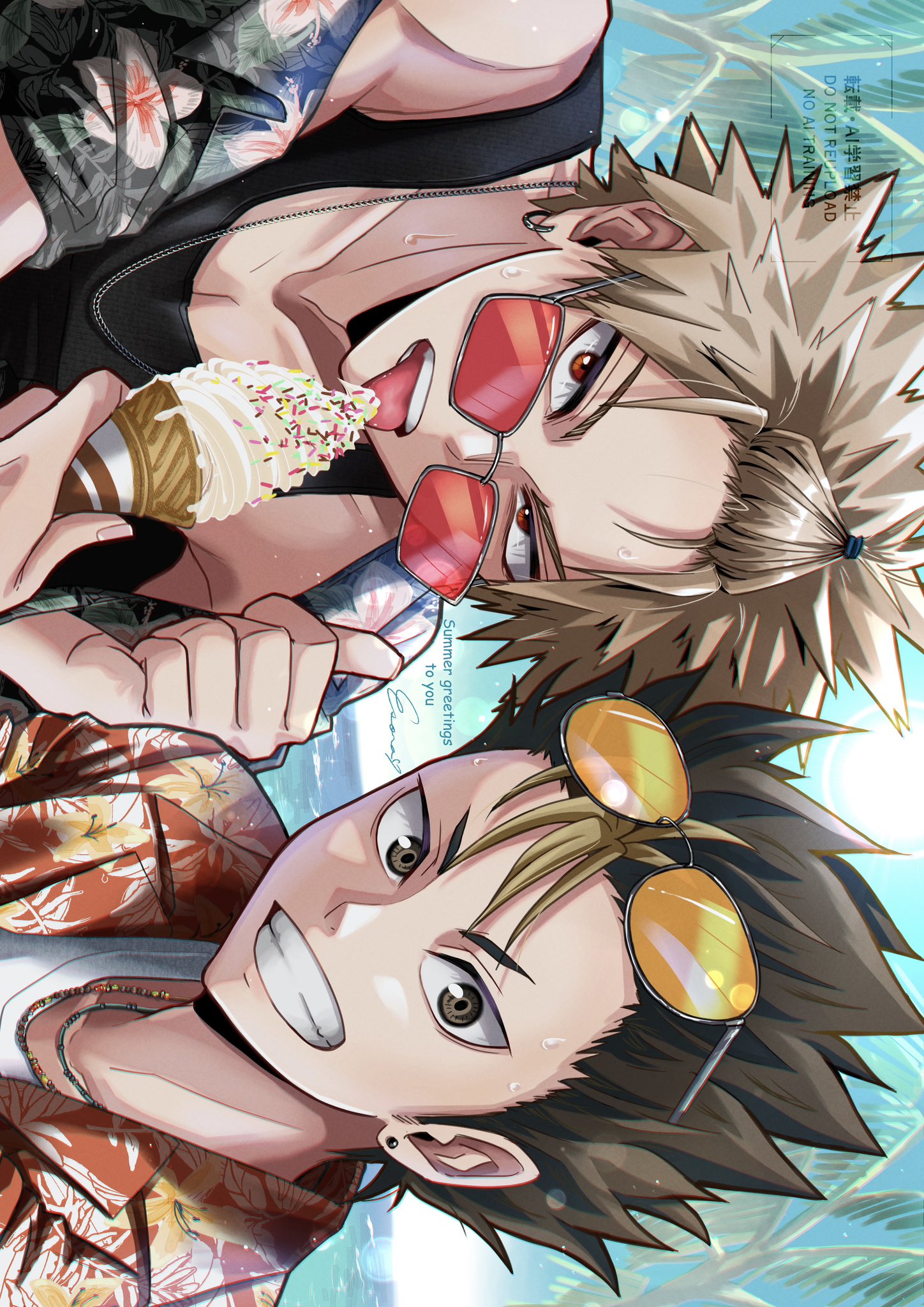 2boys alternate_costume arm_up bakugou_katsuki bangs_pinned_back bare_shoulders black_tank_top blonde_hair boku_no_hero_academia brown_eyes brown_hair commentary_request crew_neck crossover esora-arts eyewear_on_head floral_print grey-framed_eyewear grin haikyuu!! hawaiian_shirt highres holding holding_ice_cream_cone ice_cream_cone male_focus multicolored_hair multiple_boys nishinoya_yuu ocean palm_tree rectangular_eyewear red-tinted_eyewear red_eyes sanpaku shirt side-by-side sideways smile sprinkles streaked_hair summer sunglasses tank_top teeth thumbs_up tinted_eyewear tongue tongue_out tree v-shaped_eyebrows voice_actor_connection watermark white_shirt yellow-tinted_eyewear