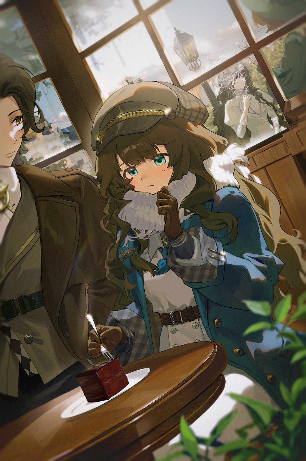 4girls belt black_hair blue_coat blue_eyes brown_belt brown_coat brown_gloves brown_hair cake cccc2445 chocolate_cake coat cowboy_shot dress dutch_angle food fork frown furrowed_brow gloves green_hat green_jacket greta_hofmann grey_hat hand_up hat highres holding holding_fork indoors isolde_(reverse:1999) jacket kakania_(reverse:1999) long_hair looking_at_another looking_at_food marcus_(reverse:1999) multiple_girls newsboy_cap open_clothes open_coat plant plate reverse:1999 round_table sachertorte_(food) scarf sitting solo_focus sweat table white_dress white_hat white_scarf window