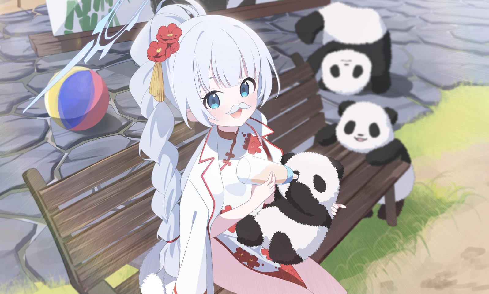 1girl baby_carry blue_archive blush bottle braid braided_ponytail carrying cherino_(blue_archive) cherino_(qipao)_(blue_archive) china_dress chinese_clothes commentary dress fake_facial_hair fake_mustache feeding flower grey_hair hair_flower hair_ornament halo holding holding_bottle jacket jacket_on_shoulders kaerunrun long_hair looking_at_viewer official_alternate_costume on_bench outdoors panda pelvic_curtain sitting smile very_long_hair white_jacket