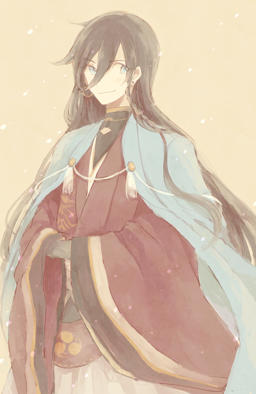 1boy asaka_yumetsuki black_hair black_shirt blue_eyes blue_haori braid brown_background closed_mouth commentary_request cowboy_shot earrings hair_between_eyes haori haori_on_shoulders highres izumi-no-kami_kanesada japanese_clothes jewelry kimono long_bangs long_hair long_sleeves male_focus mismatched_earrings red_kimono shirt shirt_under_kimono side_braid smile solo stud_earrings tassel touken_ranbu very_long_hair wide_sleeves