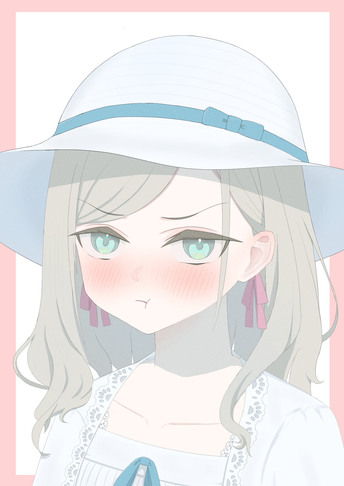 1girl :t border ceras_yanagida_lilienfeld ceras_yanagida_lilienfeld_(summer_casual) commentary dress frown hat highres jacket lace-trimmed_jacket link!_like!_love_live! love_live! official_alternate_costume open_clothes open_jacket outside_border pink_border portrait pout simple_background solo tsukida_(tsukida22) v-shaped_eyebrows virtual_youtuber white_background white_dress white_hat white_jacket