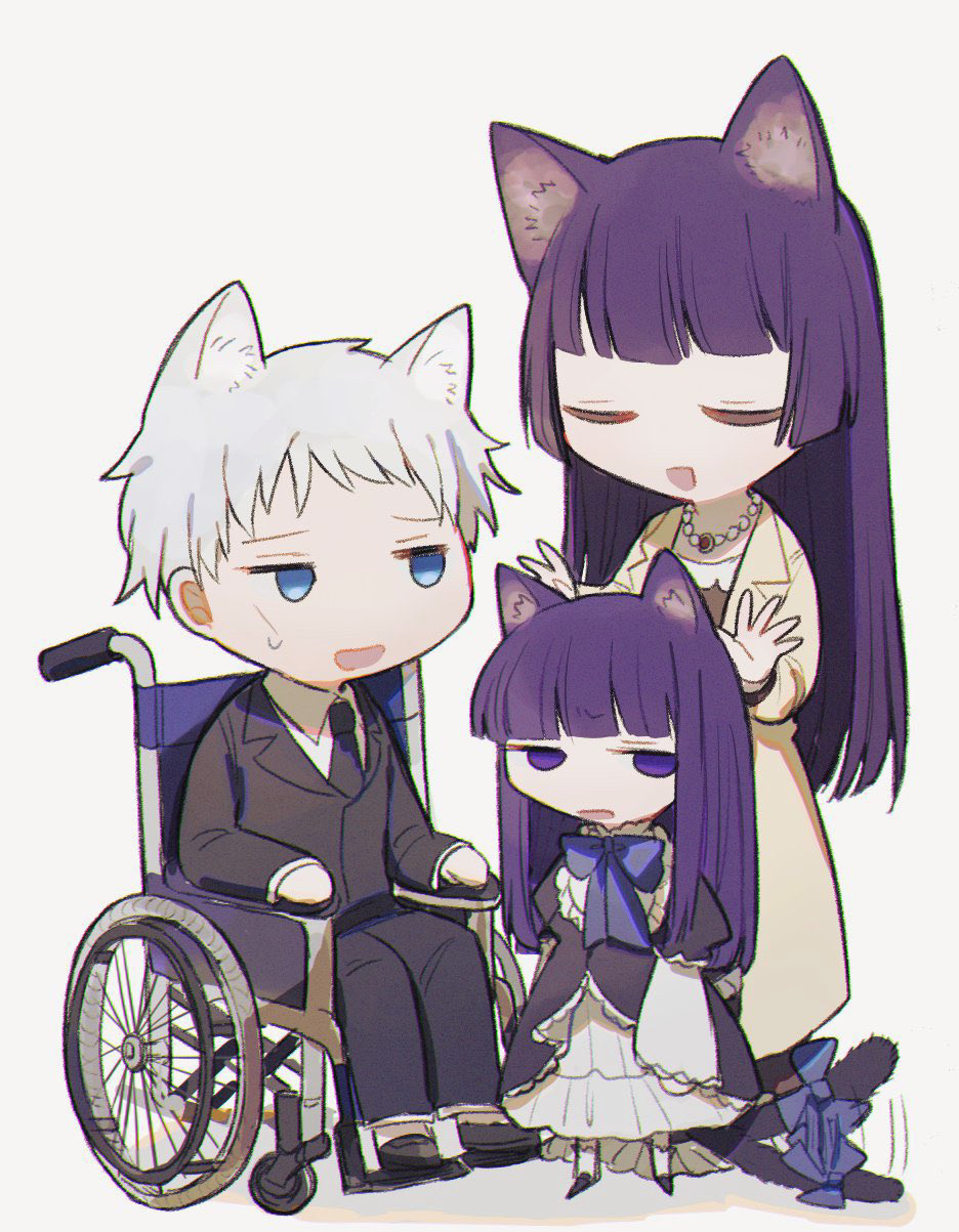 1boy 2girls animal_ear_fluff animal_ears bakara_(19083210) black_dress black_jacket black_necktie black_pants black_shoes blue_bow blue_bowtie blue_eyes bow bowtie brown_dress cat_ears cat_girl cat_tail chromatic_aberration closed_eyes coat collared_shirt commentary_request deformed dress film_grain formal_clothes frederica_bernkastel hachijou_ikuko hachijou_tooya highres hime_cut jacket jitome juliet_sleeves kemonomimi_mode lapels layered_sleeves long_hair long_sleeves multiple_girls necktie notched_lapels open_clothes open_coat open_mouth pants puffy_sleeves purple_eyes purple_hair scratches shirt shoes short_hair short_over_long_sleeves short_sleeves simple_background sitting smile socks suit sweat tail tail_bow tail_ornament tail_wagging u_u umineko_no_naku_koro_ni wheelchair white_background white_hair white_shirt white_socks yellow_coat