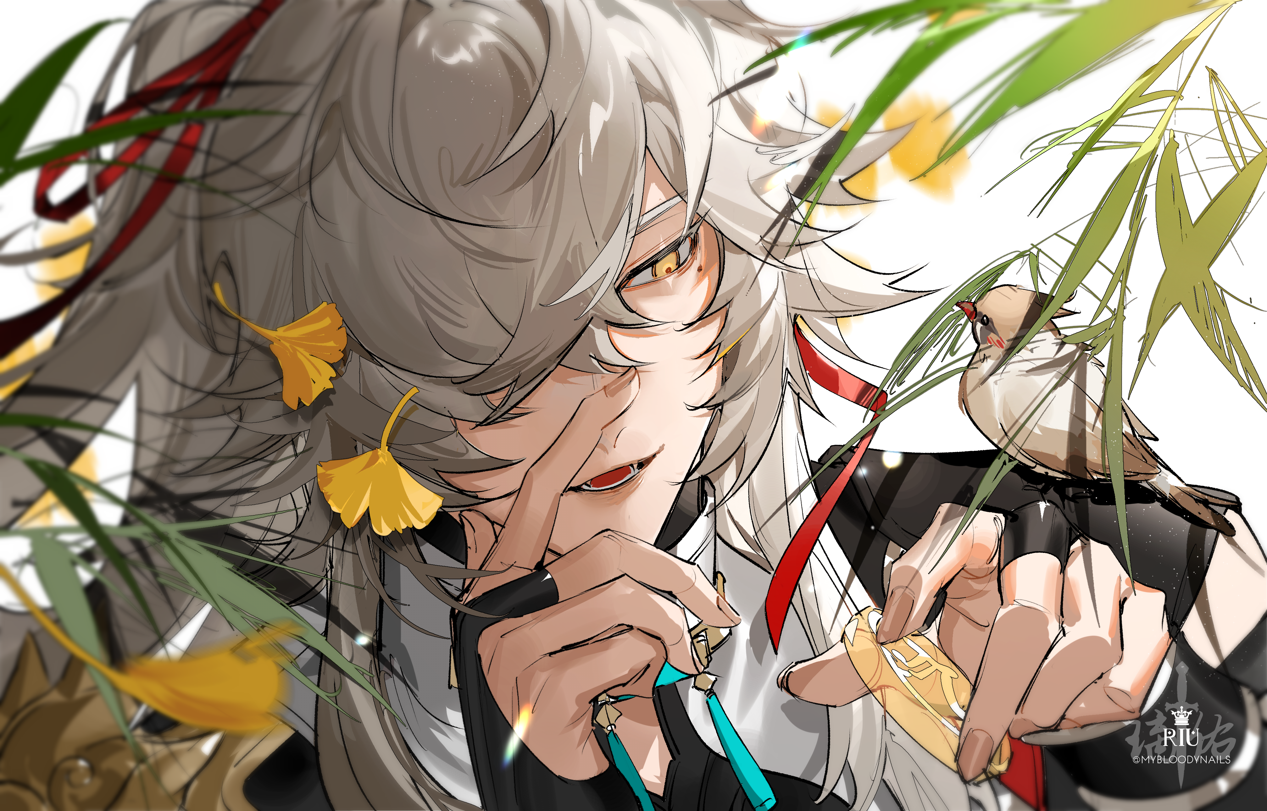 1boy absurdres armor artist_name bird bird_on_hand branch bridal_gauntlets chinese_clothes commentary_request crossed_bangs ginkgo_leaf grey_hair hair_over_one_eye hair_ribbon hands_up high_ponytail highres honkai:_star_rail honkai_(series) jing_yuan leaf long_hair male_focus mole mole_under_eye one_eye_covered open_mouth parted_bangs plant ponytail red_ribbon ribbon riu_(mybloodynails) shoulder_armor sidelocks smile solo swept_bangs tassel teeth upper_body watermark white_background yellow_eyes