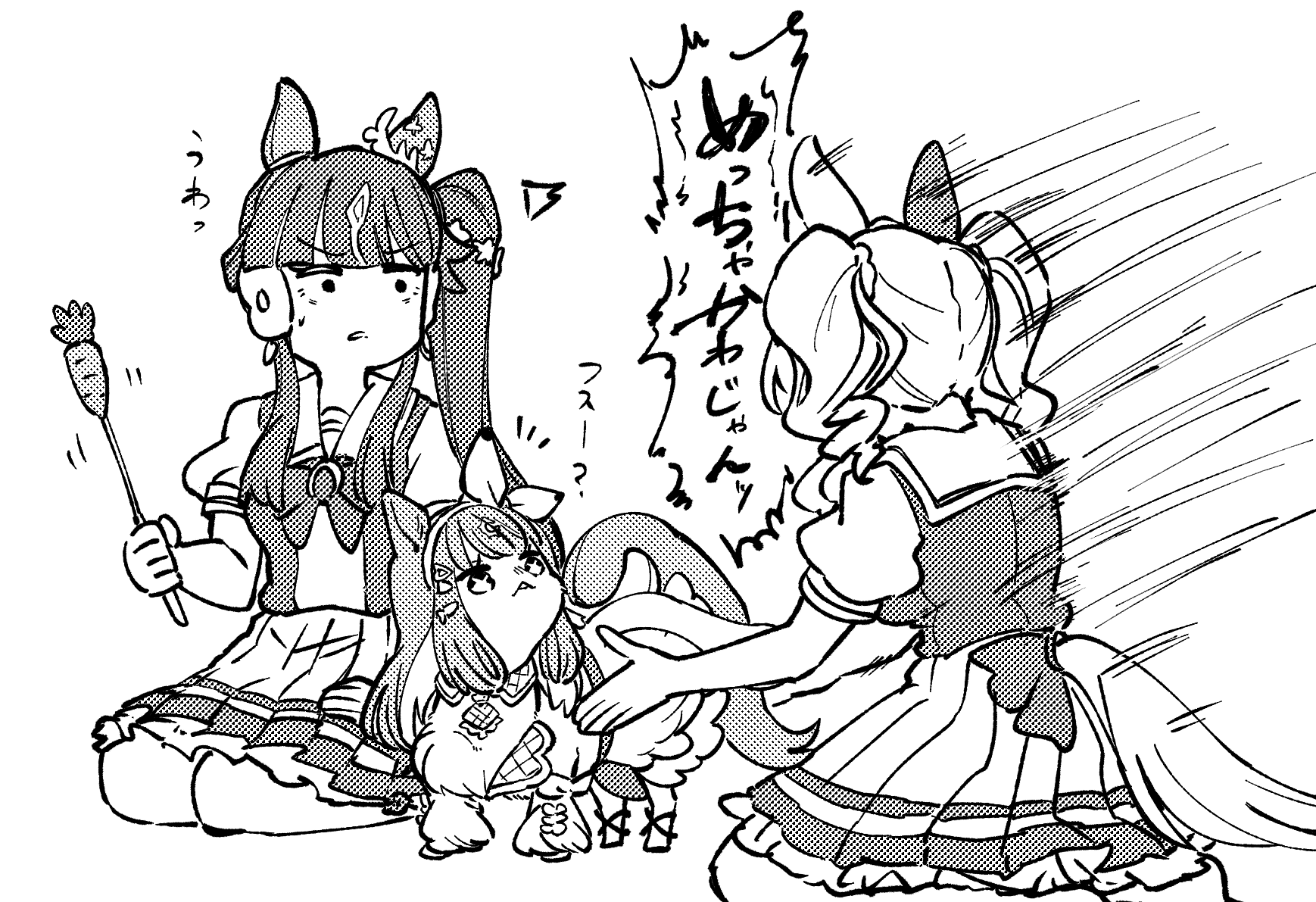2girls ^^^ almond_eye_(umamusume) animal_ears animalization blunt_bangs blunt_tresses bow carrot_on_stick clothing_cutout commentary creature curly_hair ear_covers fusaichi_pandora_(umamusume) greyscale hair_bow hair_ornament hairband hairclip headgear highres holding holding_stick horse_ears horse_girl horse_tail long_hair looking_up lucky_lilac_(umamusume) monochrome motion_lines multiple_girls notice_lines pleated_skirt puffy_short_sleeves puffy_sleeves school_uniform short_sleeves shouting side_ponytail sidelocks sitting skirt speech_bubble speed_lines star_(symbol) star_hair_ornament star_in_eye stick summer_uniform symbol_in_eye tail tail_through_clothes takatsuki_nato tracen_school_uniform translated triangle_mouth twintails umamusume very_long_hair wariza