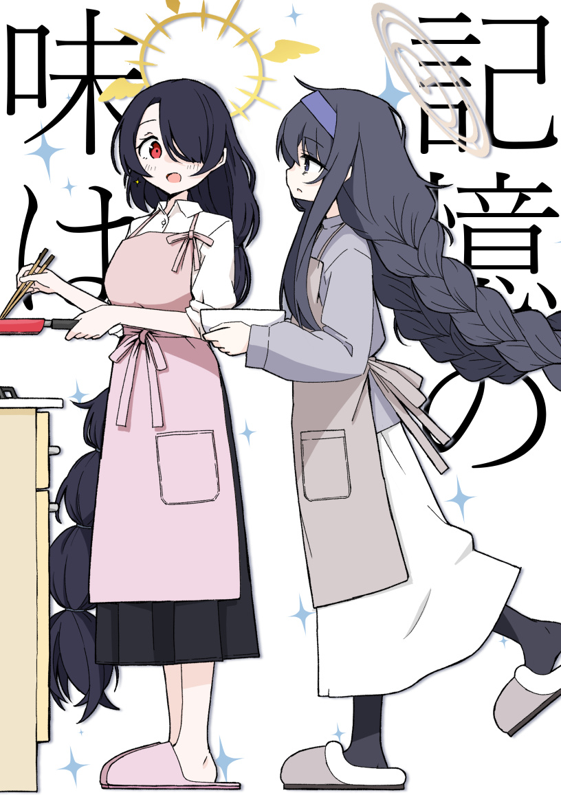 2girls apron bags_under_eyes black_hair black_skirt blue_archive blue_hairband braid brown_apron brown_slippers chopsticks collared_shirt commentary_request dress_shirt frying_pan grey_eyes grey_shirt hair_over_one_eye hairband halo hinata_(blue_archive) holding holding_chopsticks long_hair multiple_girls open_mouth parted_lips pink_apron pink_slippers pleated_skirt red_eyes shirt simple_background single_braid skirt slippers sparkle translation_request ui_(blue_archive) usui_harusame very_long_hair white_background white_shirt
