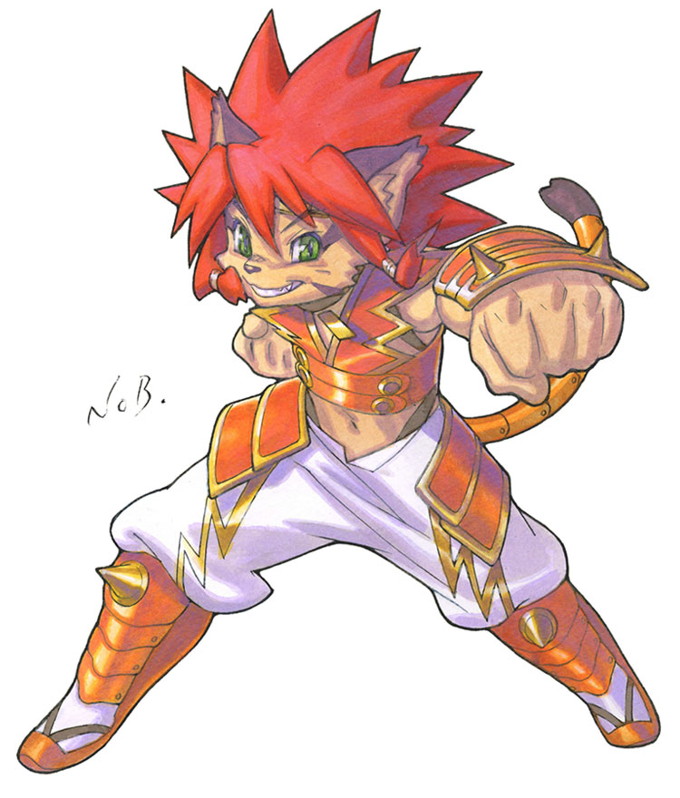 1boy animal_ear_fluff animal_ears animal_nose armor armored_boots boots calua_napage cat_boy cat_ears cat_tail clenched_hand ear_tufts full_body furry furry_male green_eyes grin incoming_attack japanese_armor little_tail_bronx male_focus medium_hair midriff navel official_art orange_boots pants punching red_hair scar shoulder_armor signature simple_background smile snout sode solatorobo solo spiked_hair standing tachi-e tail third-party_source white_background white_pants yuuki_nobuteru