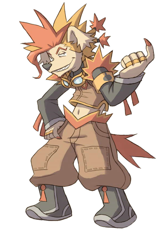 1boy animal_ears artist_request black_boots blonde_hair boots brown_pants check_artist claws dog_boy dog_ears dog_tail full_body furry furry_male goggles goggles_around_neck grin hand_on_own_hip little_tail_bronx looking_at_viewer male_focus midriff multicolored_hair navara_(solatorobo) navel official_art pants red_hair simple_background smile snout solatorobo solo spiked_hair standing tachi-e tail third-party_source white_background yuuki_nobuteru