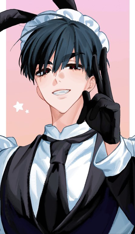1boy 2a1i7a15pb11392 alien_stage animal_ears black_eyes black_gloves black_hair black_necktie commentary_request gloves ivan_(alien_stage) long_sleeves maid_headdress male_focus necktie official_alternate_costume pink_background portrait rabbit_ears short_hair smile solo star_(symbol) v very_short_hair