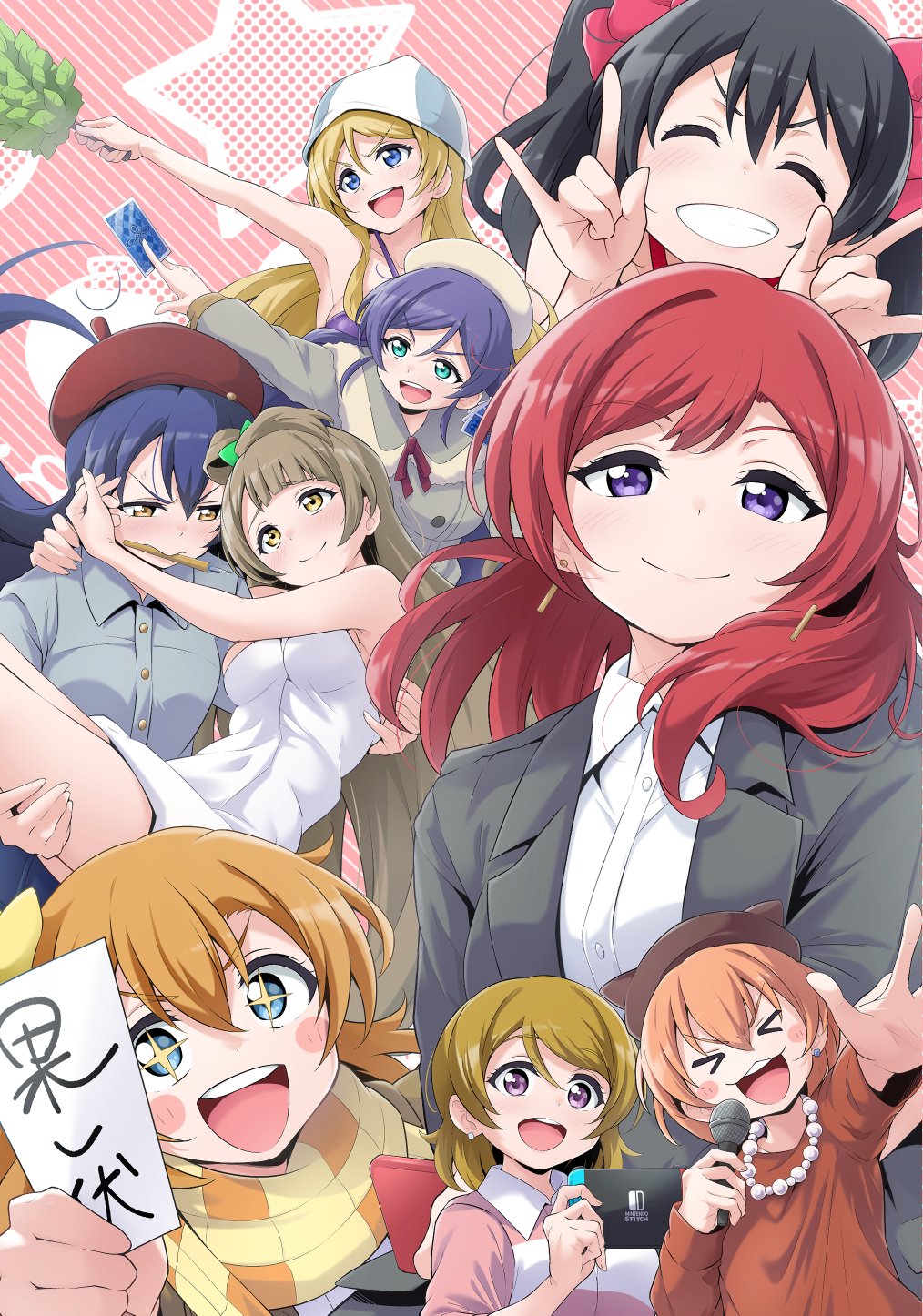 >_< 6+girls :3 ayase_eli beret black_hair blonde_hair blue_eyes blue_hair brown_hair card carrying closed_eyes closed_mouth collared_shirt diagonal-striped_background dress green_eyes grey_jacket grin hat highres holding holding_card holding_microphone holding_paper hoshizora_rin jacket jewelry kirisaki_reina koizumi_hanayo kosaka_honoka looking_at_viewer love_live! love_live!_school_idol_project microphone minami_kotori multiple_girls necklace nico_nico_nii nishikino_maki open_mouth orange_hair paper pearl_necklace pink_background playing_card princess_carry purple_eyes purple_hair red_hair shirt smile sonoda_umi striped_background tojo_nozomi white_dress yazawa_nico
