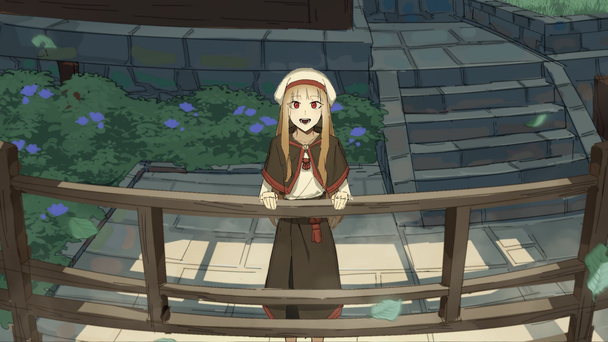 1girl :d amat80 black_capelet black_skirt brown_hair capelet day falling_leaves feet_out_of_frame highres holo leaf long_hair long_sleeves looking_at_viewer open_mouth outdoors pouch railing red_eyes shadow shirt sidelocks sketch skirt smile solo spice_and_wolf standing white_shirt