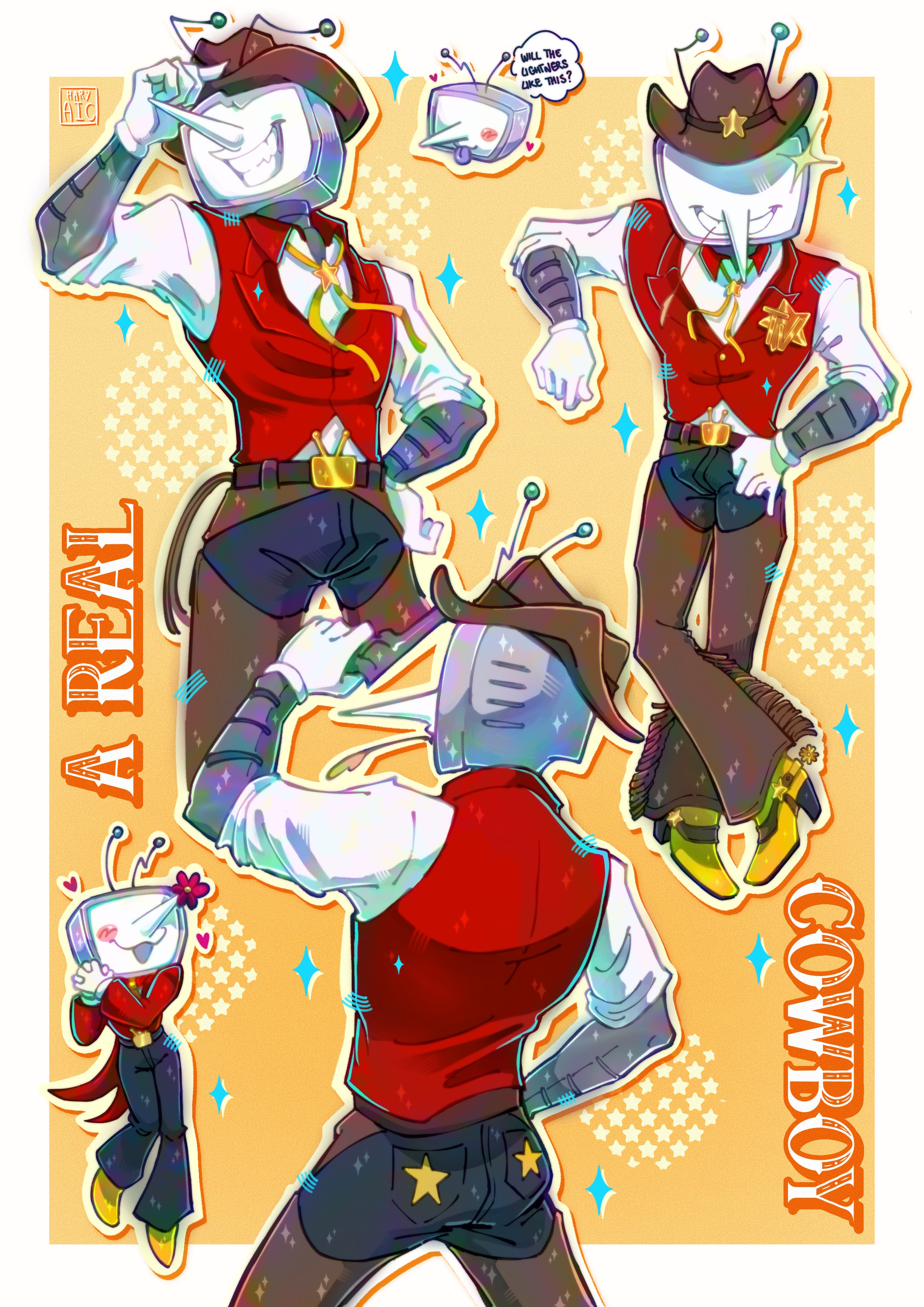 1boy absurdres ant_tenna ant_tenna_(shootout) antennae belt belt_buckle black_pants brown_belt brown_hat buckle chaps clothed_robot collared_shirt commentary cowboy_hat crt deltarune drop_shadow english_commentary english_text flower gloves hand_on_own_hip hat highres humanoid_robot long_nose male_focus maryaic mouth_hold multiple_views necktie object_head outline pants pointy_nose red_vest robot shirt shoes smile sparkle stalk_in_mouth tailcoat teeth utdr_(toby_fox) vest white_gloves white_outline white_shirt yellow_necktie yellow_shoes