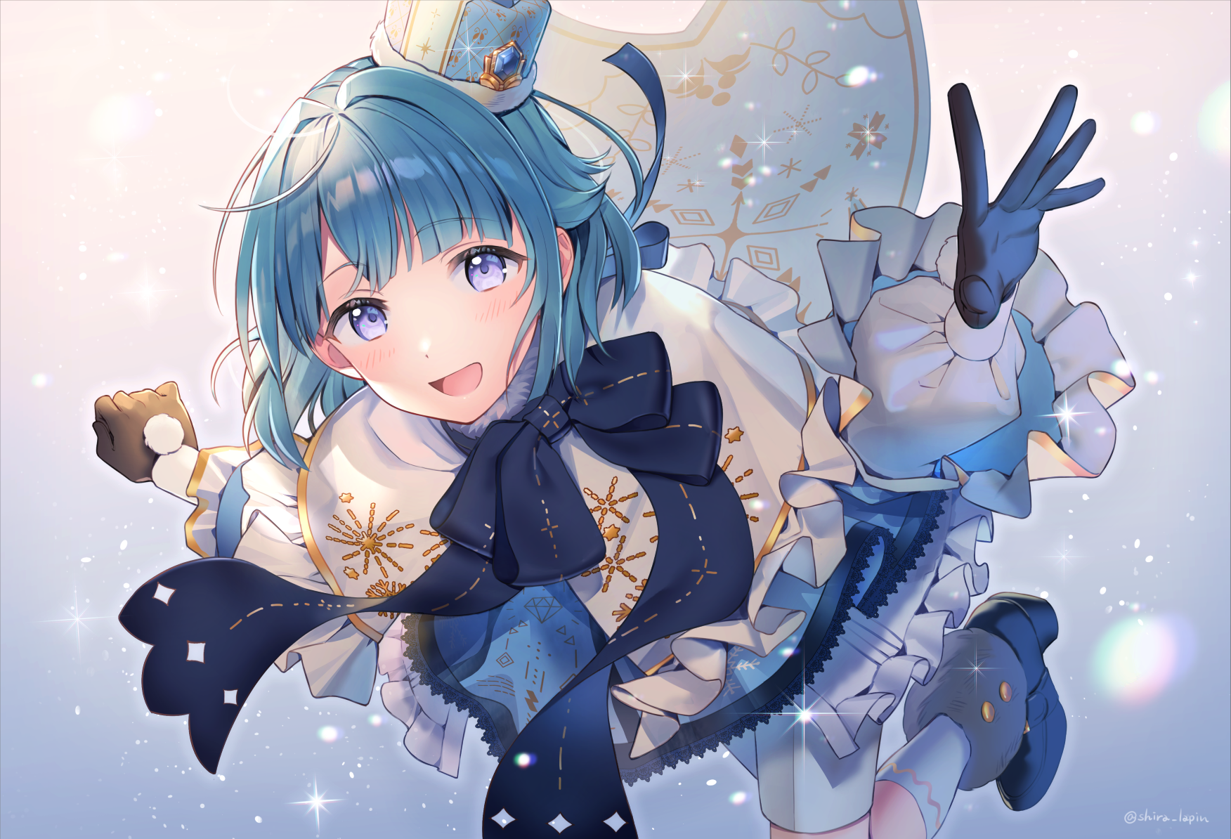 1boy backlighting bad_id bad_twitter_id bent_over blue_boots blue_bow blue_bowtie blue_hair blush boots bow bowtie brown_gloves capelet commentary_request ensemble_stars! frilled_capelet frilled_sleeves frills full_body fur-trimmed_boots fur-trimmed_headwear fur_trim gloves gradient_background grey_background hat highres kneehighs long_sleeves looking_at_viewer male_focus open_mouth poncho puffy_sleeves purple_eyes shino_hajime shino_hajime_(brancho_brancho) shirakino short_hair shorts smile snowflake_print socks solo sparkle twitter_username waving white_background white_shorts white_snow's_merry_xmas_(ensemble_stars!) white_socks