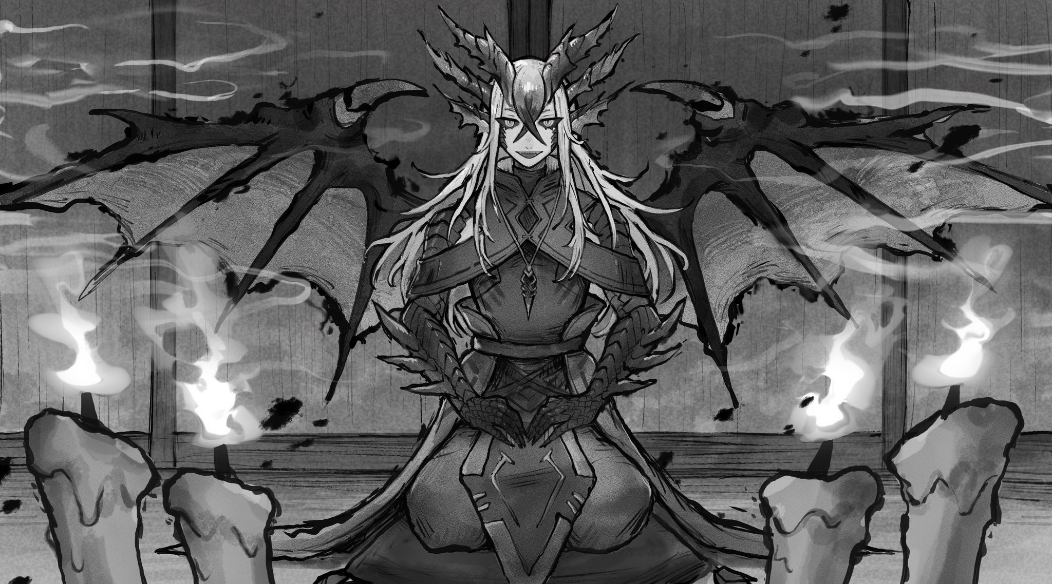 1boy animal_ears animal_hands candle capelet claws clothing_cutout colored_sclera commentary_request cushion dragon_boy dragon_ears dragon_horns dragon_wings full_body greyscale hands_on_own_thighs high_collar highres horns indie_virtual_youtuber indoors long_hair looking_at_viewer male_focus monochrome monster_boy pelvic_curtain ruteko_(ruko220) scales seiza shoulder_cutout sitting slit_pupils solo spread_wings wings zabuton