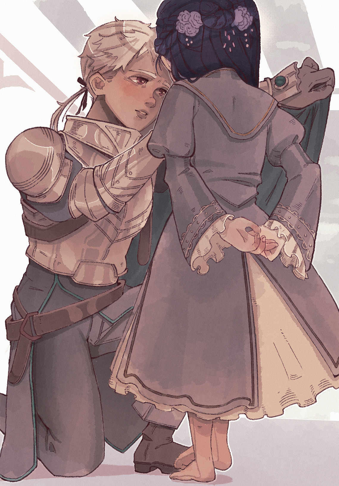 1boy 1girl armor arms_behind_back black_pants black_shoes cape dress eye_contact flower gauntlets hair_flower hair_ornament highres honeyjello honzuki_no_gekokujou lestilaut_(honzuki_no_gekokujou) long_sleeves looking_at_another myne_(honzuki_no_gekokujou) own_hands_together pants ponytail red_eyes shoes