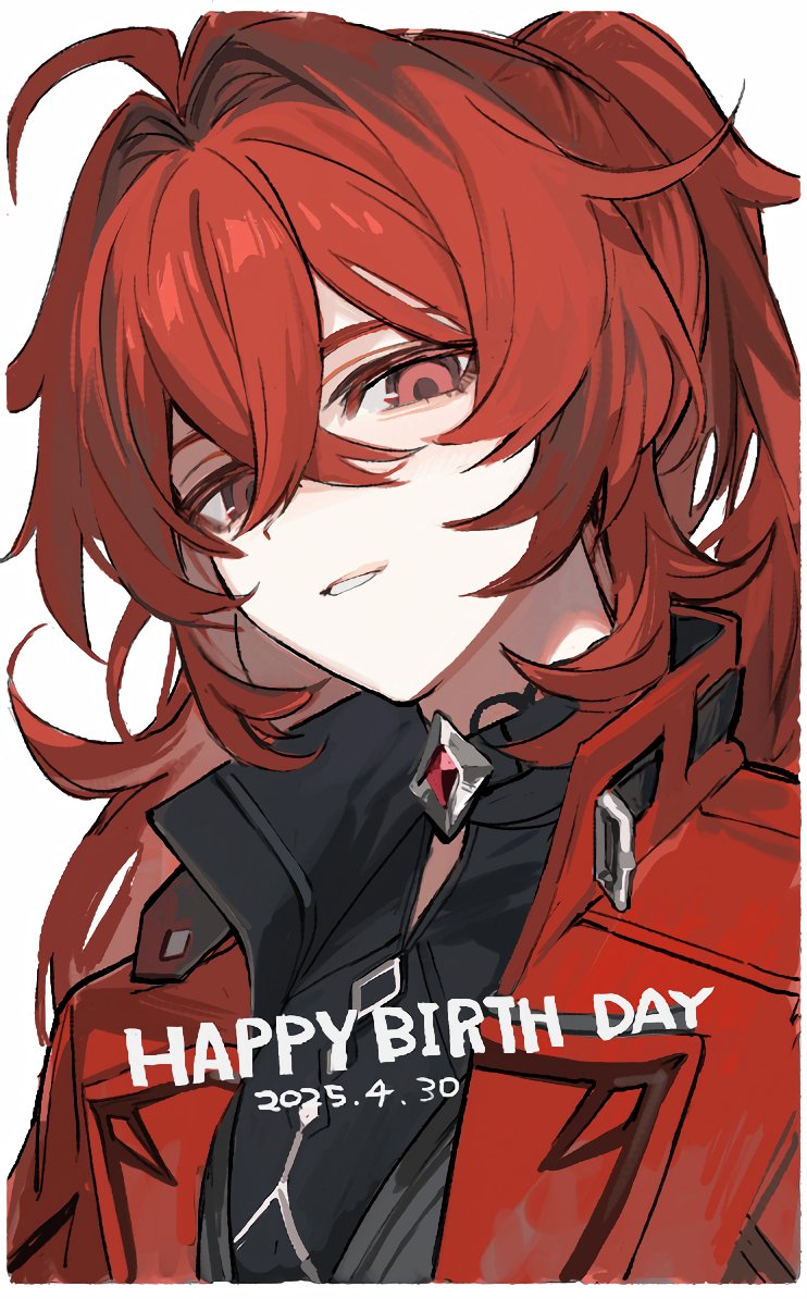 ahoge black_shirt coat crossed_bangs dated diluc_(genshin_impact) diluc_(red_dead_of_night)_(genshin_impact) genshin_impact hair_between_eyes happy_birthday kaawaisann long_hair looking_at_viewer male_focus parted_lips red_coat red_eyes red_hair shirt simple_background solo upper_body white_background
