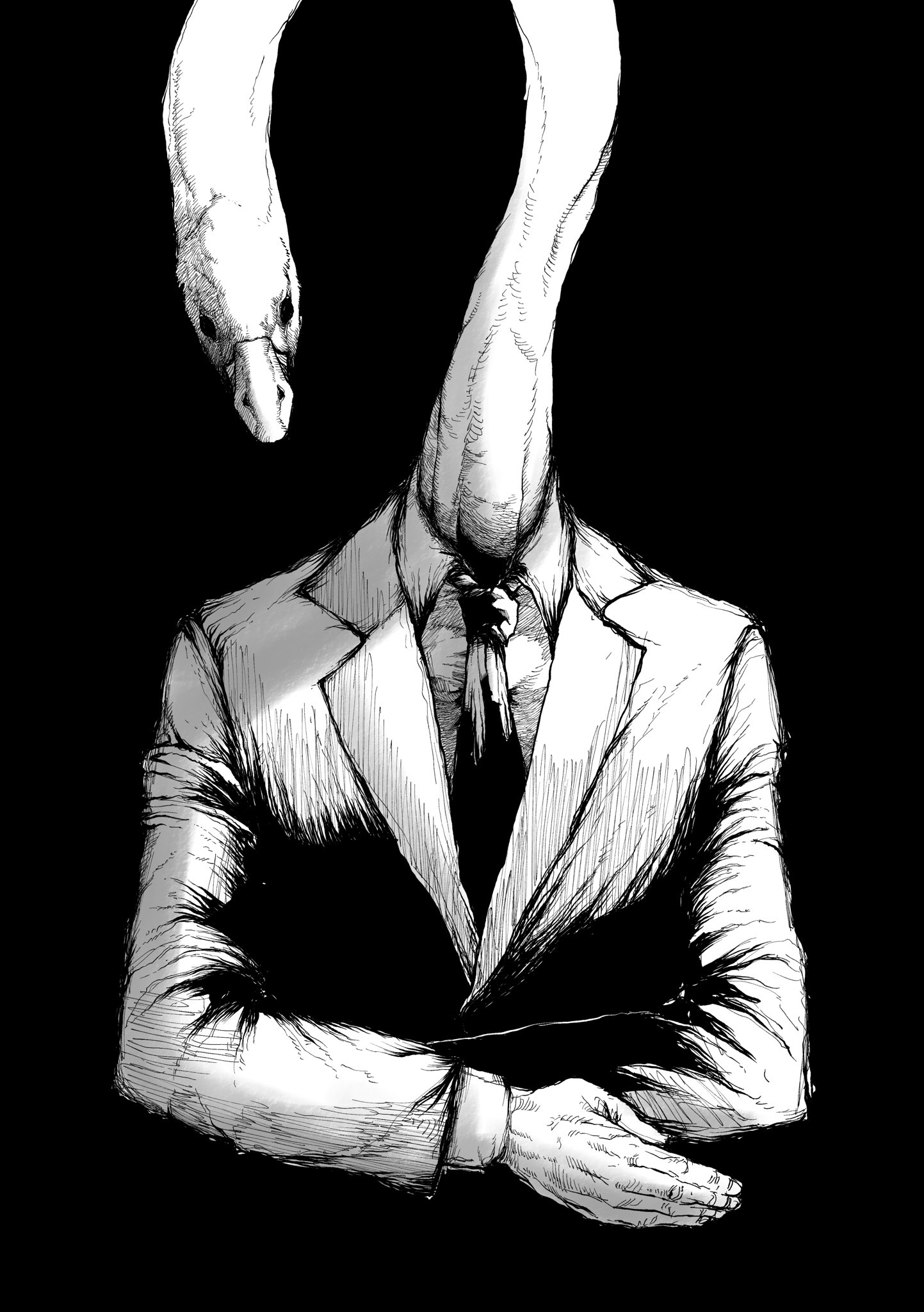 1boy animal_head beak bird bird_boy black_background collared_shirt formal_clothes greyscale hatching_(texture) highres jacket jirou_2018 lapels male_focus monochrome necktie original shirt simple_background solo suit suit_jacket swan upper_body