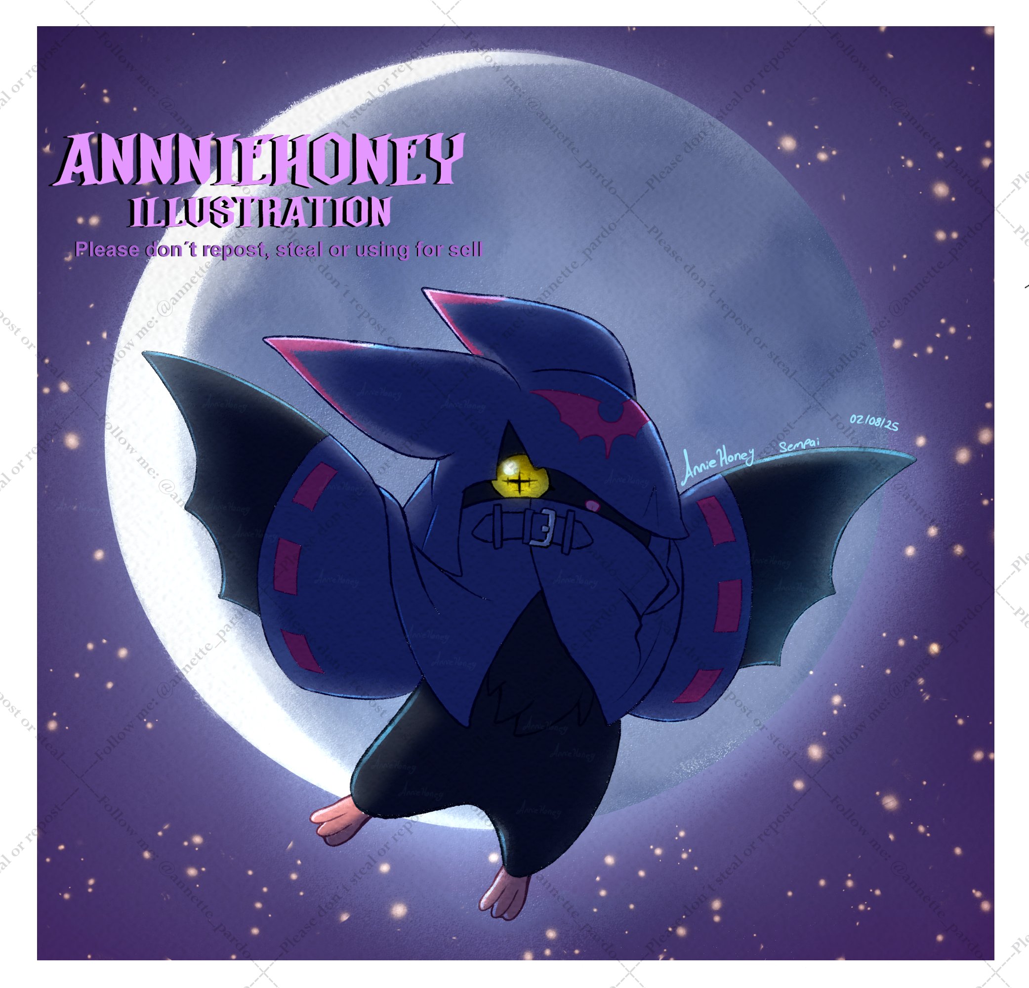 annette_pardo bat_(animal) blue_hood border chiropmon digimon digimon_(creature) full_body full_moon highres hood hood_up midair moon night no_humans watermark white_border yellow_eyes