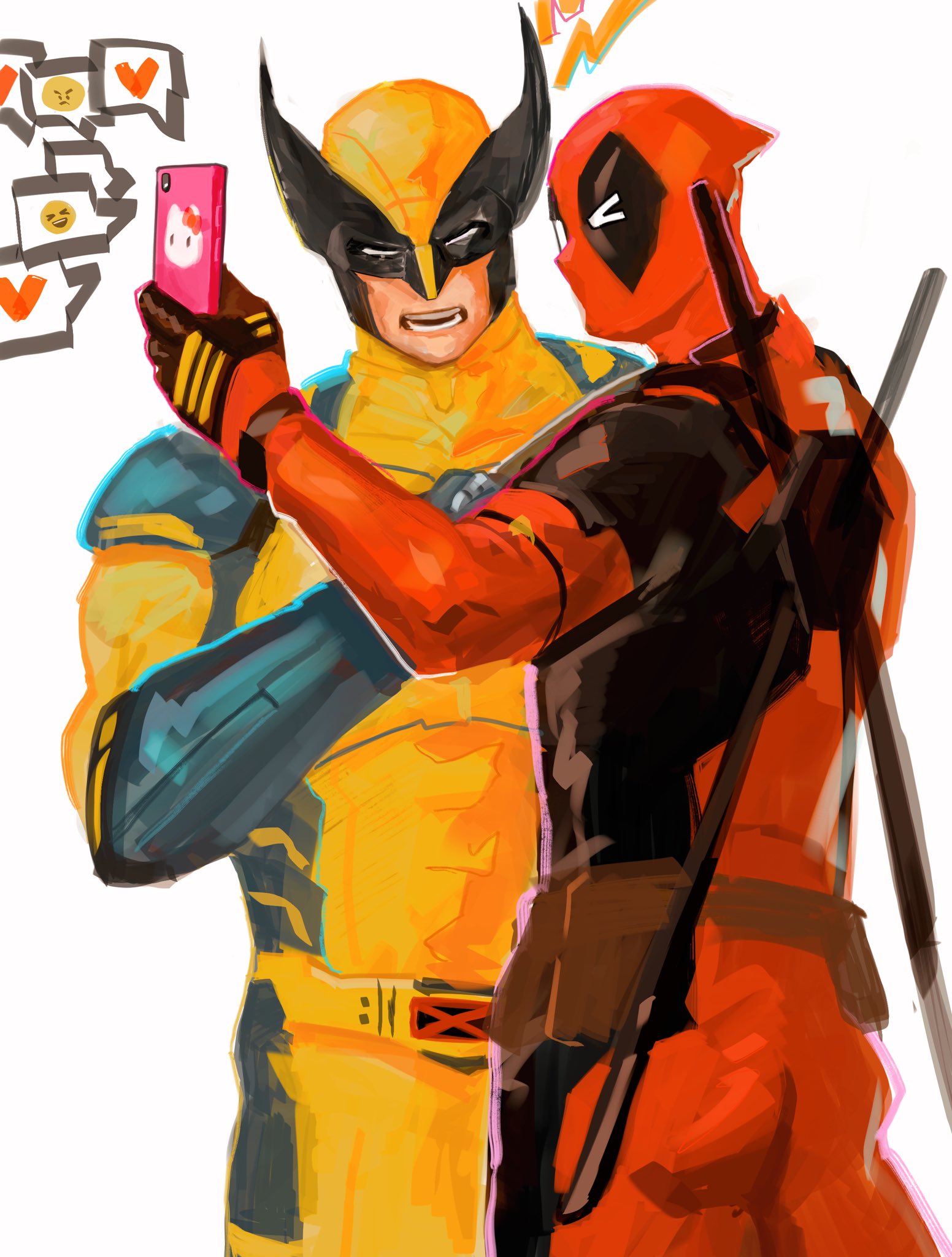 2boys black_gloves bodysuit cellphone deadpool deadpool_&_wolverine deadpool_(series) gloves hamu_popopo hello_kitty highres holding holding_phone male_focus marvel multicolored_bodysuit multiple_boys muscular muscular_male one_eye_closed open_mouth phone red_bodysuit red_mask sanrio smartphone spoken_expression superhero_costume teeth two-tone_bodysuit wolverine_(x-men) x-men yellow_bodysuit