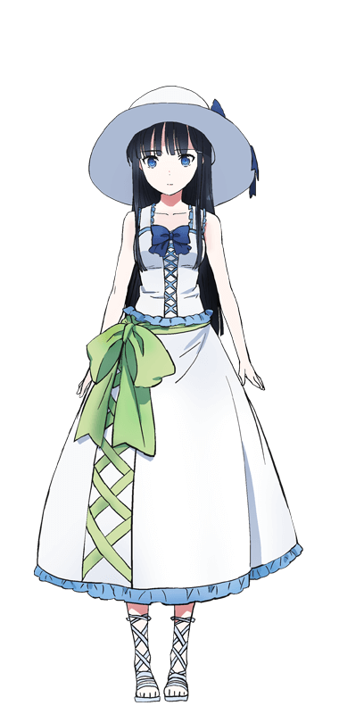 1girl anime_coloring black_hair blue_bow blue_eyes bow breasts child collarbone colored_skin dress full_body green_ribbon hat ishida_kana large_breasts large_hat long_hair long_sidelocks looking_at_viewer mahouka_koukou_no_rettousei official_art ribbon sandals shiba_miyuki sidelocks simple_background sleeveless sleeveless_dress solo standing transparent_background white_hat white_sandals white_skin