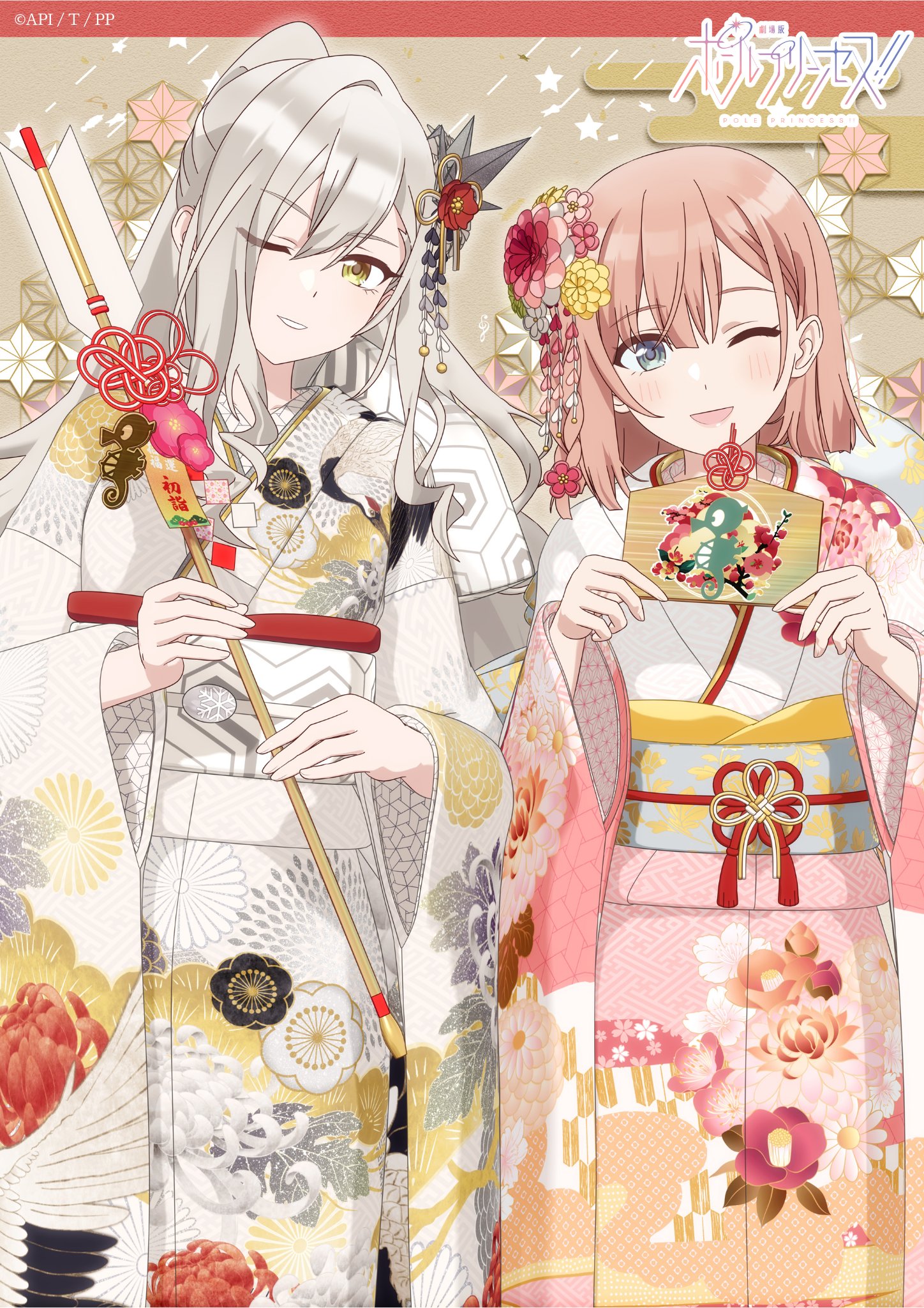 2girls 3d arm_up arrow_(projectile) bird braid breasts brown_hair chrysanthemum cleavage copyright_name crane_(animal) ema fish floral_print flower furisode grey_eyes grey_hair hair_between_eyes hair_flower hair_ornament hamaya happy_new_year hatsumoude highres hinano_hoshikita japanese_clothes kimono light_blush long_hair long_sleeves looking_at_viewer mikoshiro_yukari multiple_girls new_year obi one_eye_closed open_mouth orizuru parted_lips pink_kimono pole_princess!! ponytail print_kimono sash seahorse short_hair smile standing white_kimono yellow_eyes