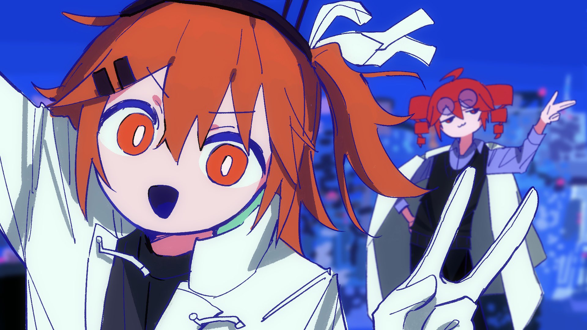 2girls :3 a.i._voice adachi_rei ahoge bell black_shirt black_vest blue_shirt blurry blurry_background closed_mouth coat coat_on_shoulders collared_shirt drill_hair eyewear_on_head finger_gun hair_ornament hair_ribbon hairband hairclip highres izayoi_(i34i22w) jingle_bell kasane_teto looking_at_viewer multiple_girls one_side_up open_mouth orange_eyes orange_hair pure_white_memories_(idolmaster) red_eyes red_hair ribbon round_eyewear selfie shirt short_hair solo_focus sunglasses twin_drills upper_body utau v v-shaped_eyebrows vest white_coat