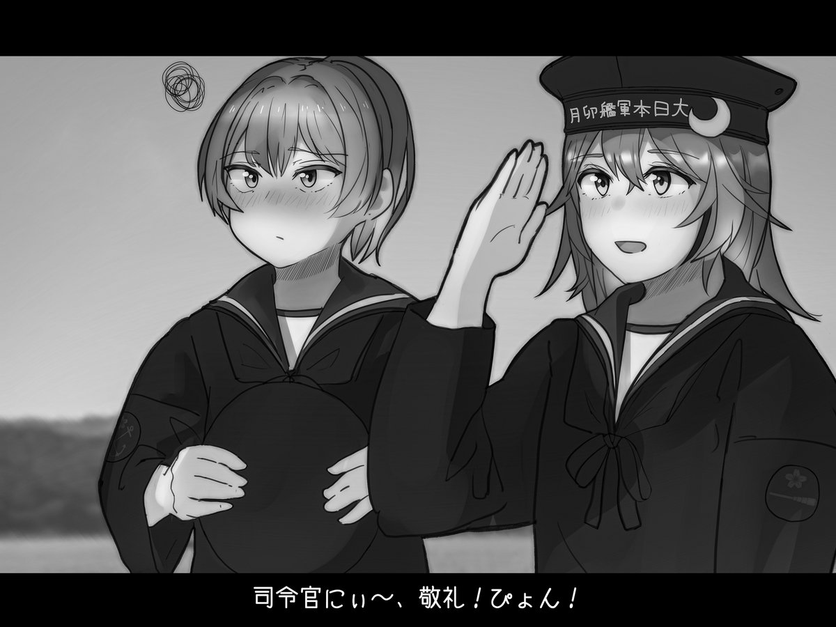 2girls alternate_costume anchor_symbol blurry blurry_background blush closed_mouth commentary_request crescent crescent_hat_ornament day hair_between_eyes hat hat_ornament hieda_(hiedanoaqn) holding holding_unworn_clothes holding_unworn_hat kantai_collection letterboxed long_sleeves looking_at_viewer monochrome multiple_girls neckerchief open_mouth outdoors ponytail sailor_collar salute shiranui_(kancolle) squiggle translation_request unworn_hat unworn_headwear uzuki_(kancolle) wide_sleeves