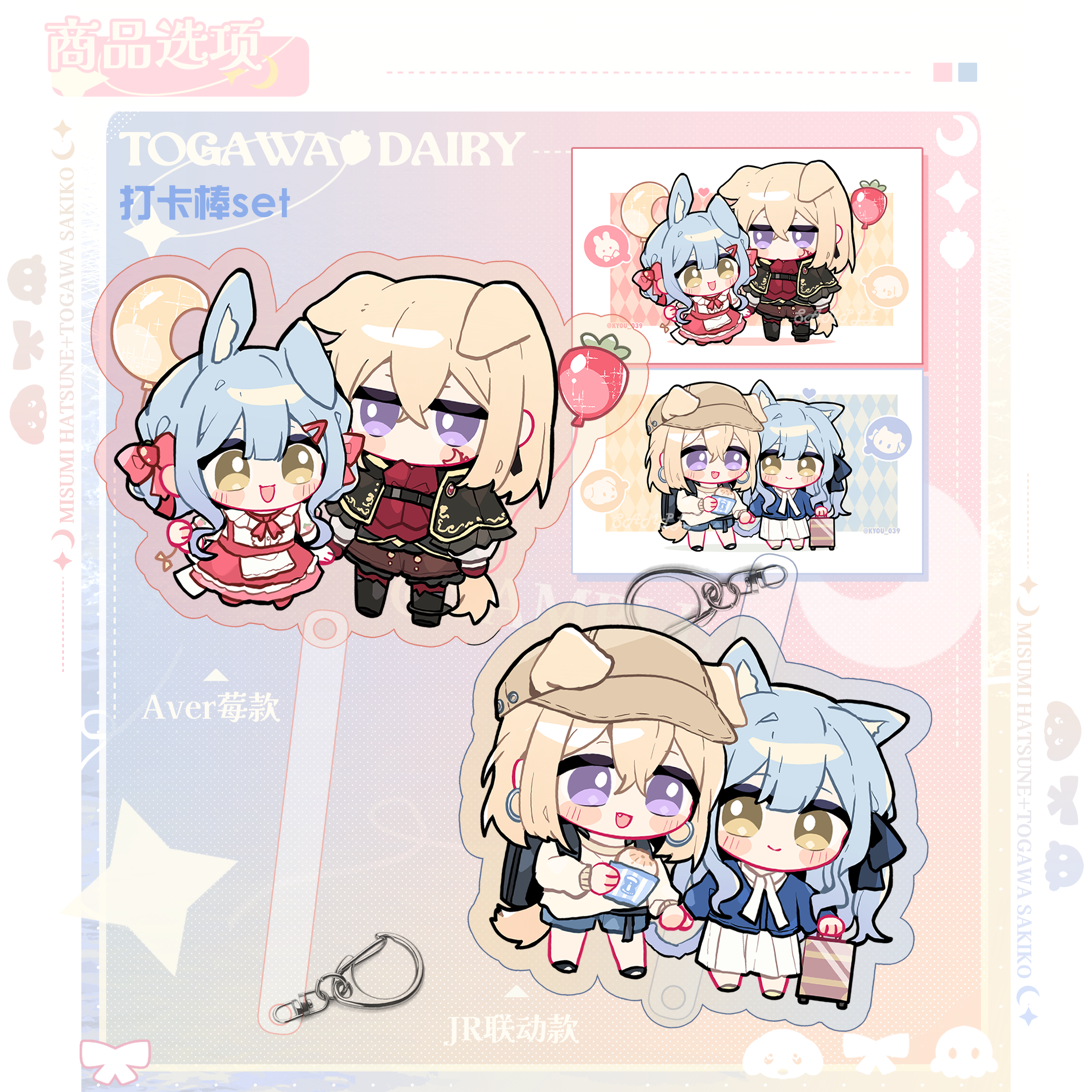 2girls animal_ears aver_(yumenokessho) backpack bag bang_dream! bang_dream!_it's_mygo!!!!! baseball_cap black_bag blonde_hair blue_cardigan blue_hair blue_shorts bow brown_hat capelet cardigan cat_ears cat_girl cat_tail chibi chinese_commentary chinese_text commentary_request dog_ears dog_girl dog_tail doloris_(bang_dream!) earrings ears_through_headwear fang hair_between_eyes hair_bow hair_ornament hairclip hat highres holding_hands jewelry kemonomimi_mode kyou_039 merchandise_available misumi_uika multiple_girls open_mouth purple_eyes rabbit_ears rabbit_girl rabbit_tail red_bow red_capelet red_skirt shorts sidelocks skirt sweets_paradise tail togawa_sakiko translation_request yellow_eyes yumenokessho