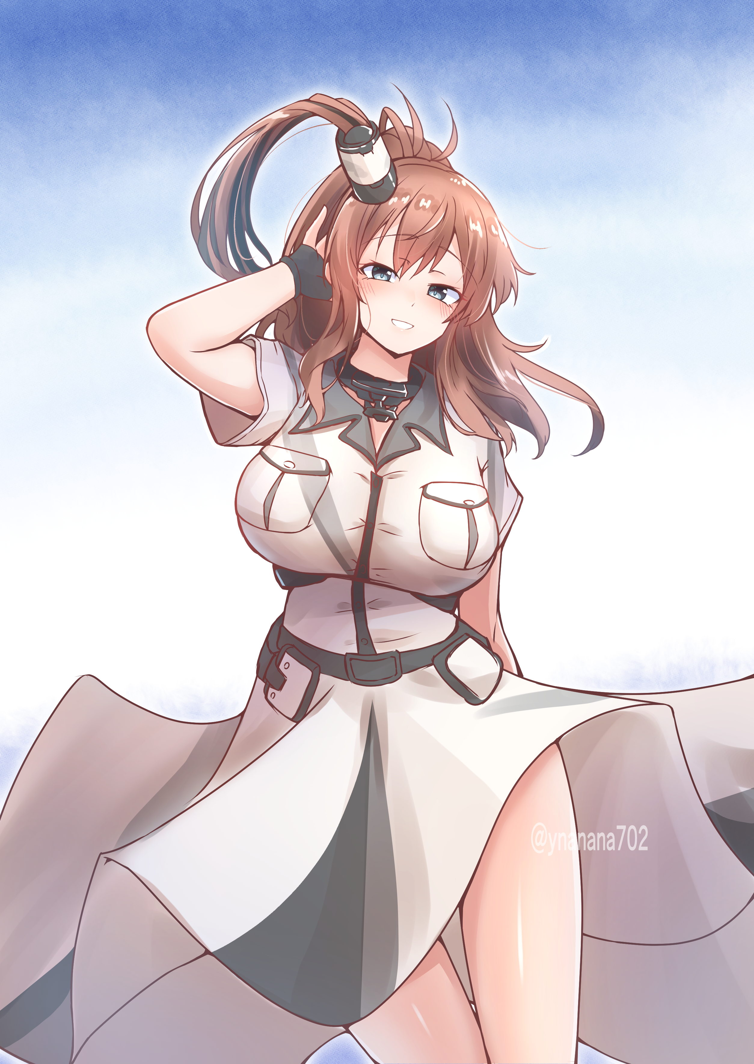 1girl 702_(naotsu) absurdres anchor_choker black_gloves blue_eyes breasts brown_hair cowboy_shot dress gloves highres kantai_collection large_breasts long_hair looking_at_viewer open_mouth ponytail saratoga_(kancolle) saratoga_mk_ii_(kancolle) side_ponytail smile solo white_dress