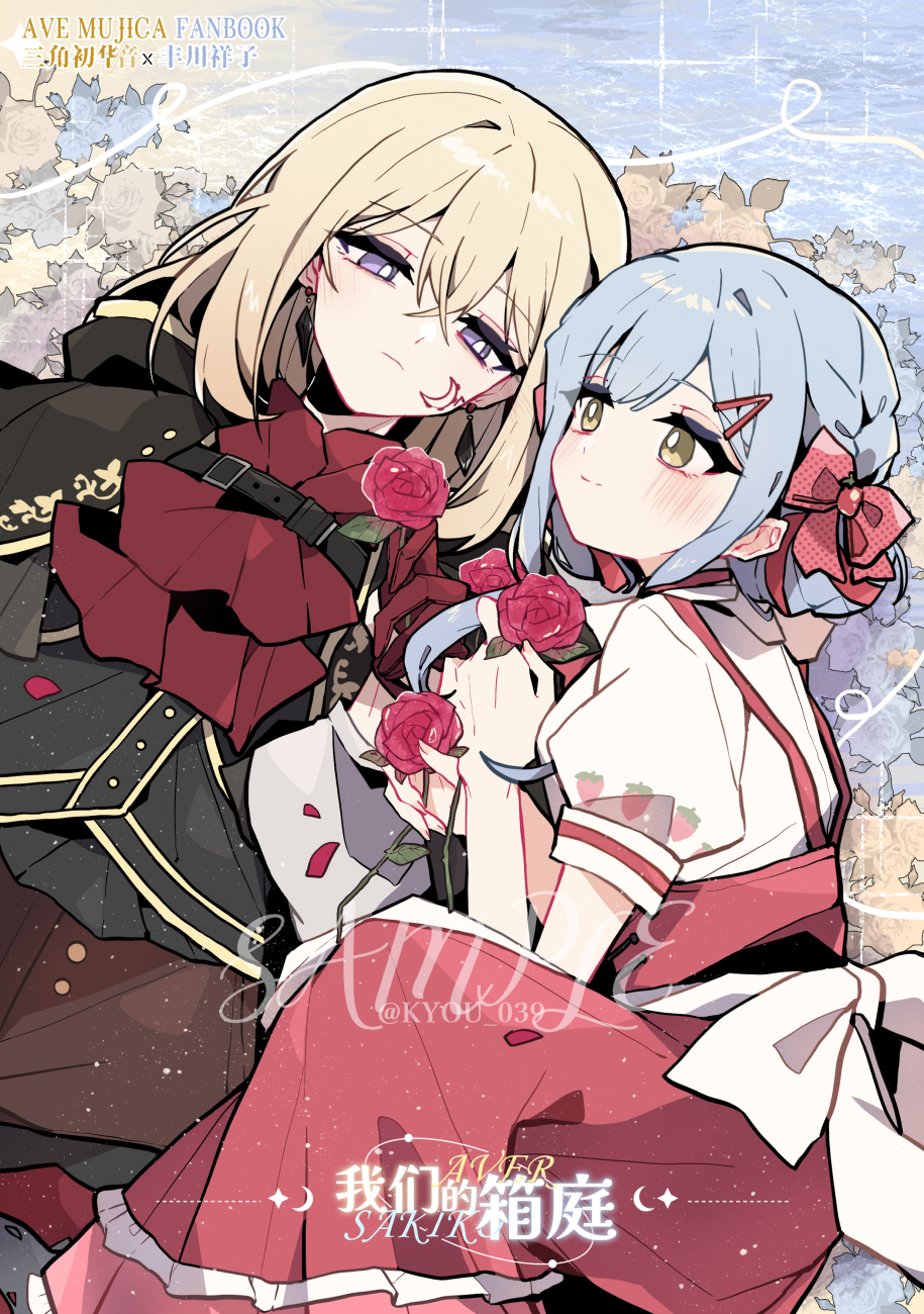 2girls aver_(yumenokessho) bang_dream! bang_dream!_it's_mygo!!!!! blonde_hair blue_hair blush bow chinese_commentary closed_mouth commentary_request doloris_(bang_dream!) earrings facial_mark flower gloves hair_between_eyes hair_bow hair_ornament hairclip highres jewelry kyou_039 medium_hair misumi_uika multiple_girls partially_translated purple_eyes red_bow red_flower red_gloves red_rose red_skirt rose shirt short_hair skirt spoilers sweets_paradise togawa_sakiko translation_request white_shirt yellow_eyes yumenokessho yuri