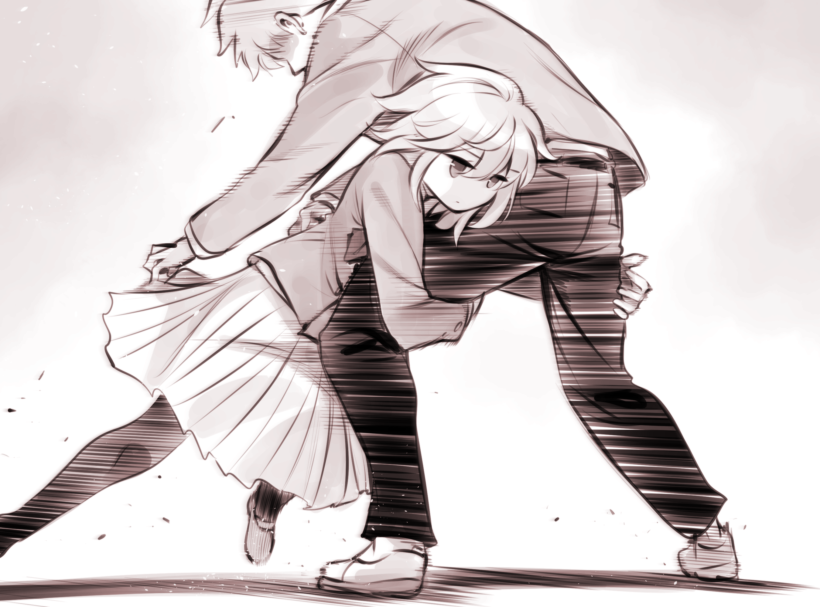 1boy 1girl blazer commentary_request expressionless expressionless_kouhai_(kato_takuji) grabbing_another's_leg highres jacket jitome kato_takuji long_sleeves medium_skirt monochrome motion_lines original pants pantyhose pleated_skirt school_uniform sepia short_hair skirt speed_lines wrestling