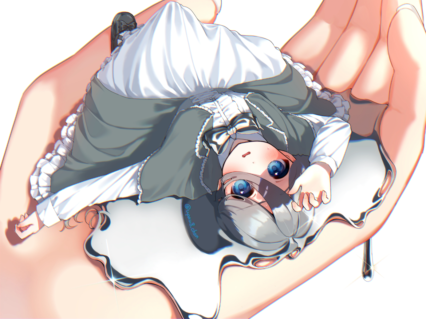 1girl 1other black_shoes blue_eyes bow bowtie center_frills commentary dress dripping footwear_bow frilled_dress frills grey_bow grey_bowtie grey_hair hair_between_eyes holding holding_mini_person in_palm liquid_hair long_sleeves mini_person minigirl open_mouth original shading_eyes shoes size_difference upaneru_(upau8_chan) wavy_mouth white_dress