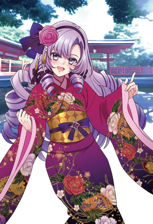 1girl :d architecture black_hairband blush day drill_hair east_asian_architecture floral_print flower furisode hair_flower hair_ornament hair_ribbon hairband hyakumantenbara_salome index_finger_raised japanese_clothes kimono long_hair long_sleeves looking_at_viewer nijisanji obi open_mouth outdoors parted_bangs print_kimono purple_eyes purple_hair purple_kimono purple_ribbon red_kimono ribbon rose sash smile standing unizo very_long_hair virtual_youtuber wide_sleeves