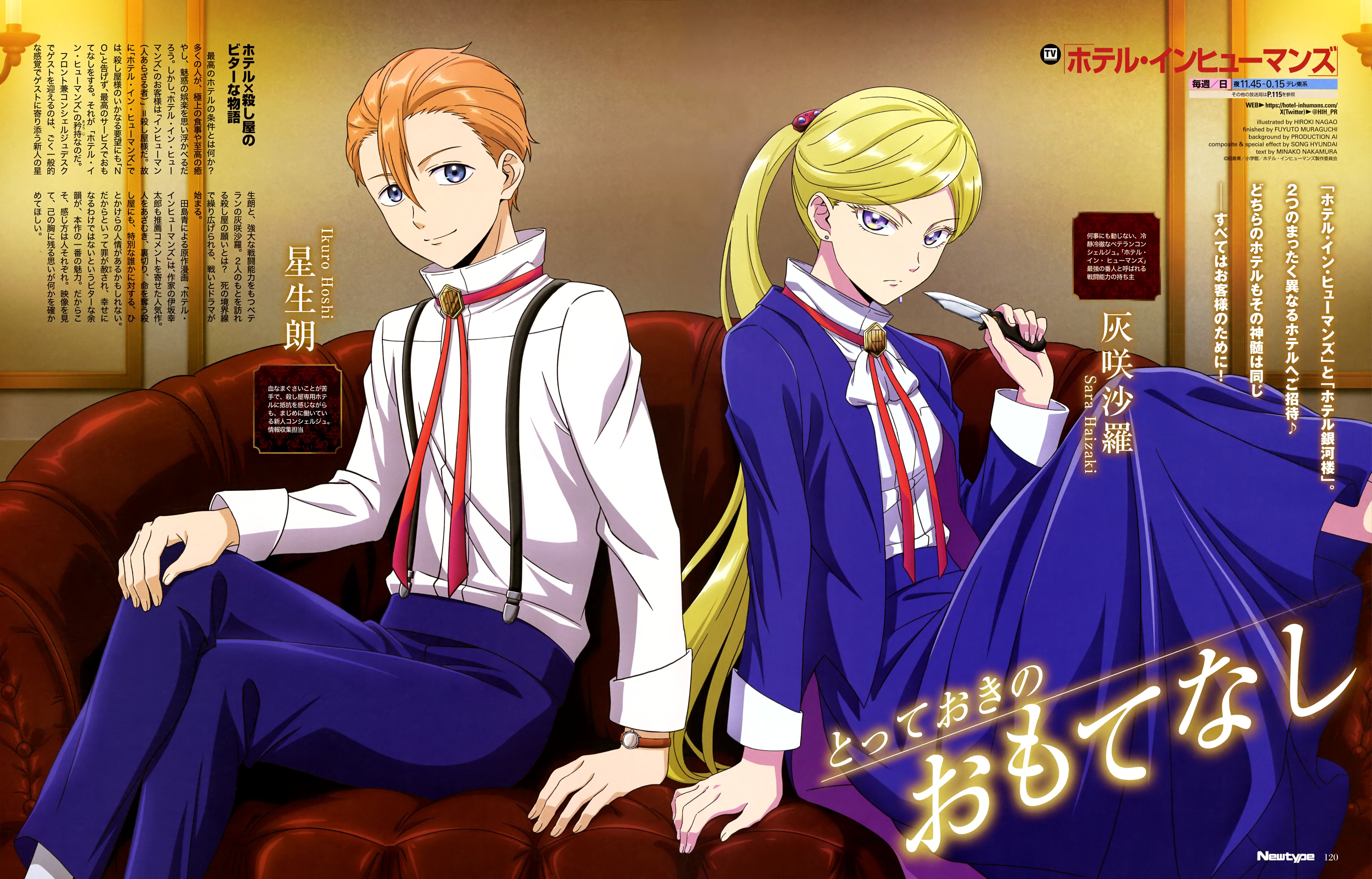 1boy 1girl absurdres anime_coloring artist_name blonde_hair blue_eyes blue_jacket blue_pants blue_skirt breasts character_name copyright_name copyright_notice couch crossed_legs earrings hair_between_eyes hair_slicked_back haizaki_sara hand_on_own_knee hand_rest high_ponytail highres hiroki_(vvkagerouvvr2) holding holding_knife hoshi_ikurou hotel_inhumans indoors jacket jewelry knife light_frown long_hair long_skirt long_sleeves looking_at_viewer looking_to_the_side newtype official_art on_couch open_clothes open_jacket orange_hair page_number pants ponytail purple_eyes shirt shirt_tucked_in sitting skirt smile socks stud_earrings suspenders third-party_source twitter_username very_long_hair watch watermark web_address white_shirt white_socks wristwatch