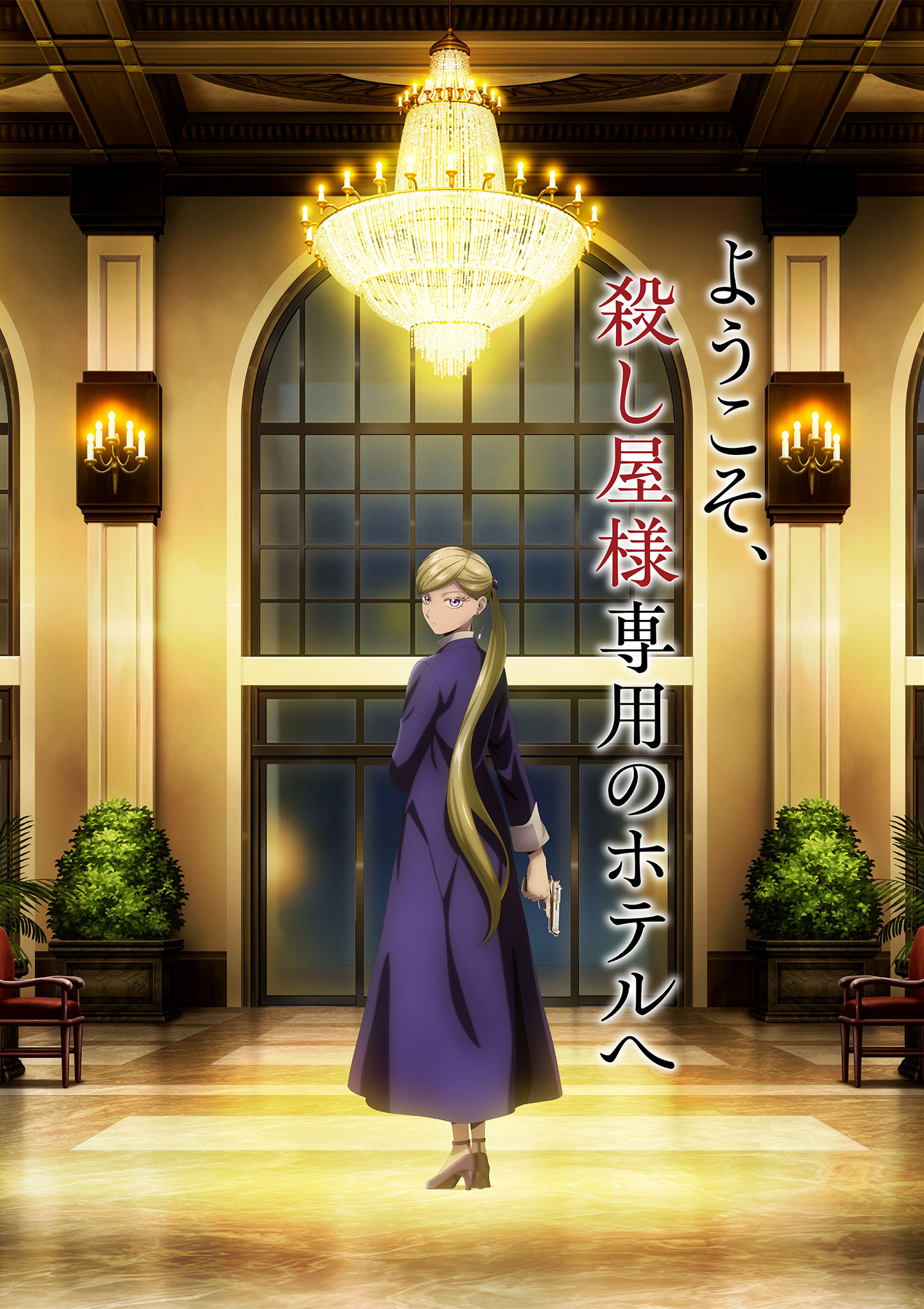 1girl anime_coloring blonde_hair candle ceiling chandelier coat earrings floor gun haizaki_sara handgun high_heels highres holding holding_gun holding_weapon hotel_inhumans indoors jewelry key_visual light_frown long_hair long_sleeves looking_at_viewer looking_back official_art plant ponytail potted_plant promotional_art purple_coat purple_eyes shirt shoes solo standing translated very_long_hair weapon white_shirt window