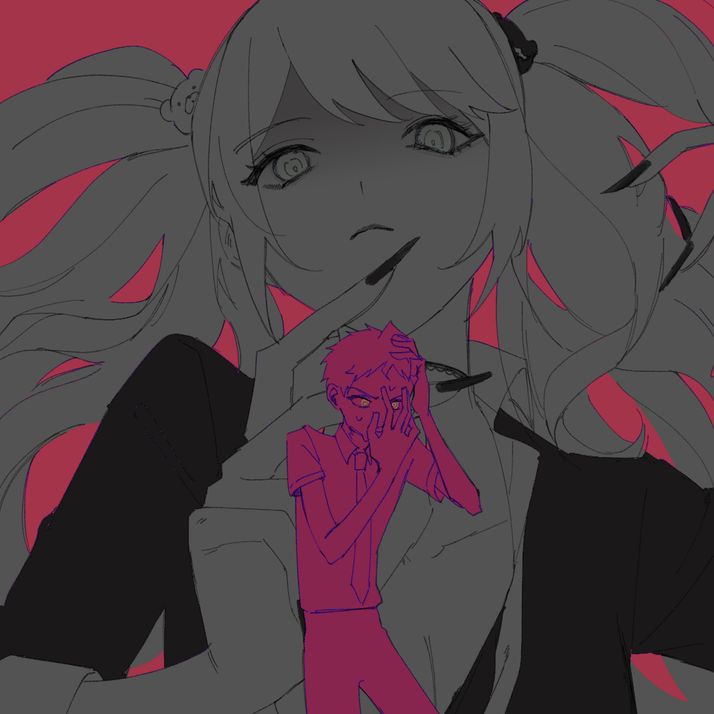 1boy 1girl bear_hair_ornament black_nails danganronpa_(series) danganronpa_2:_goodbye_despair enoshima_junko eyelashes fingernails hair_ornament hand_on_own_head hinata_hajime long_fingernails long_hair multiple_monochrome necktie oji-sama_(ochi4t) pink_background ringed_eyes spoilers twintails