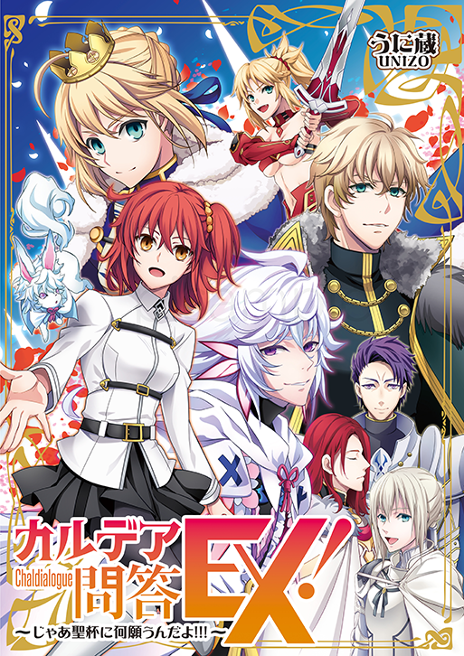 3girls 4boys 5boys ahoge armor artoria_pendragon_(fate) bedivere_(fate) black_pantyhose blonde_hair blue_eyes braid cape chaldea_uniform cover crown excalibur_(fate/stay_night) fate/grand_order fate_(series) fou_(fate) fujimaru_ritsuka_(female) gawain_(fate) green_eyes hair_ornament hair_scrunchie lancelot_(fate/grand_order) long_hair looking_at_viewer merlin_(fate) mordred_(fate) multiple_boys multiple_girls open_mouth pantyhose petals ponytail purple_eyes purple_hair red_hair scrunchie short_hair skirt smile sword tristan_(fate) unizo weapon