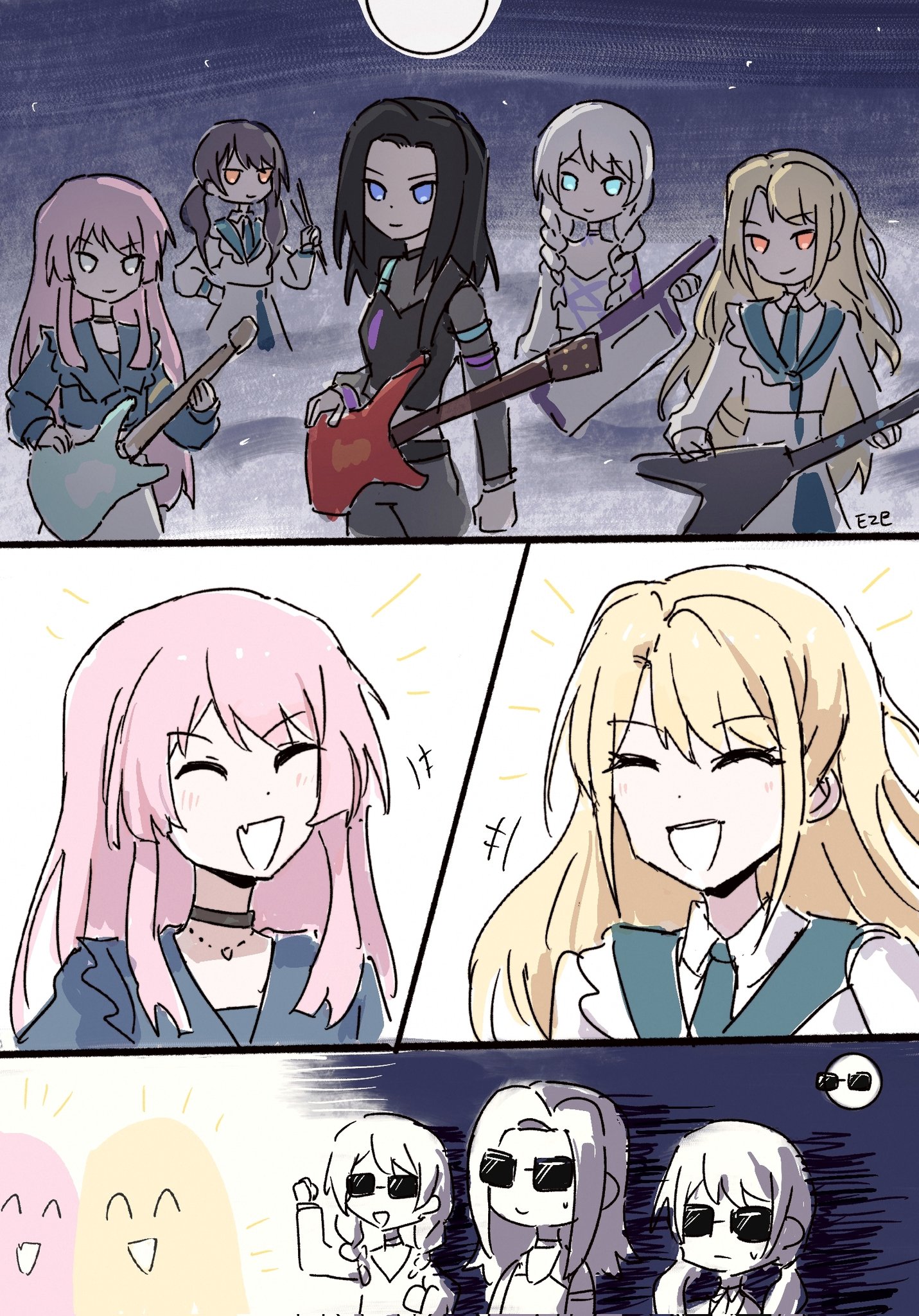 5girls bang_dream! bang_dream!_girls_band_party! bang_dream!_it's_mygo!!!!! black_hair blonde_hair chihaya_anon chinese_commentary commentary_request eyewear_on_head eze6688z futaba_tsukushi glasses guitar highres instrument kirigaya_toko long_hair multiple_girls open_mouth pink_hair smile sunglasses twintails wakamiya_eve wakana_rei