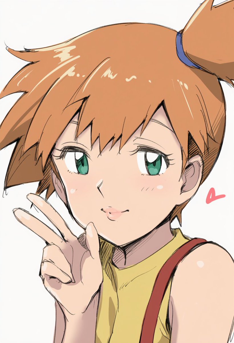 1girl asymmetrical_hair bare_shoulders blush closed_mouth eyelashes green_eyes hair_tie hand_up highres jaydamon lips looking_at_viewer misty_(pokemon) nintendo orange_hair pink_lips pokemon pokemon_(anime) pokemon_(classic_anime) ponytail shirt short_hair side_ponytail sleeveless sleeveless_shirt smile solo suspenders upper_body v w yellow_shirt