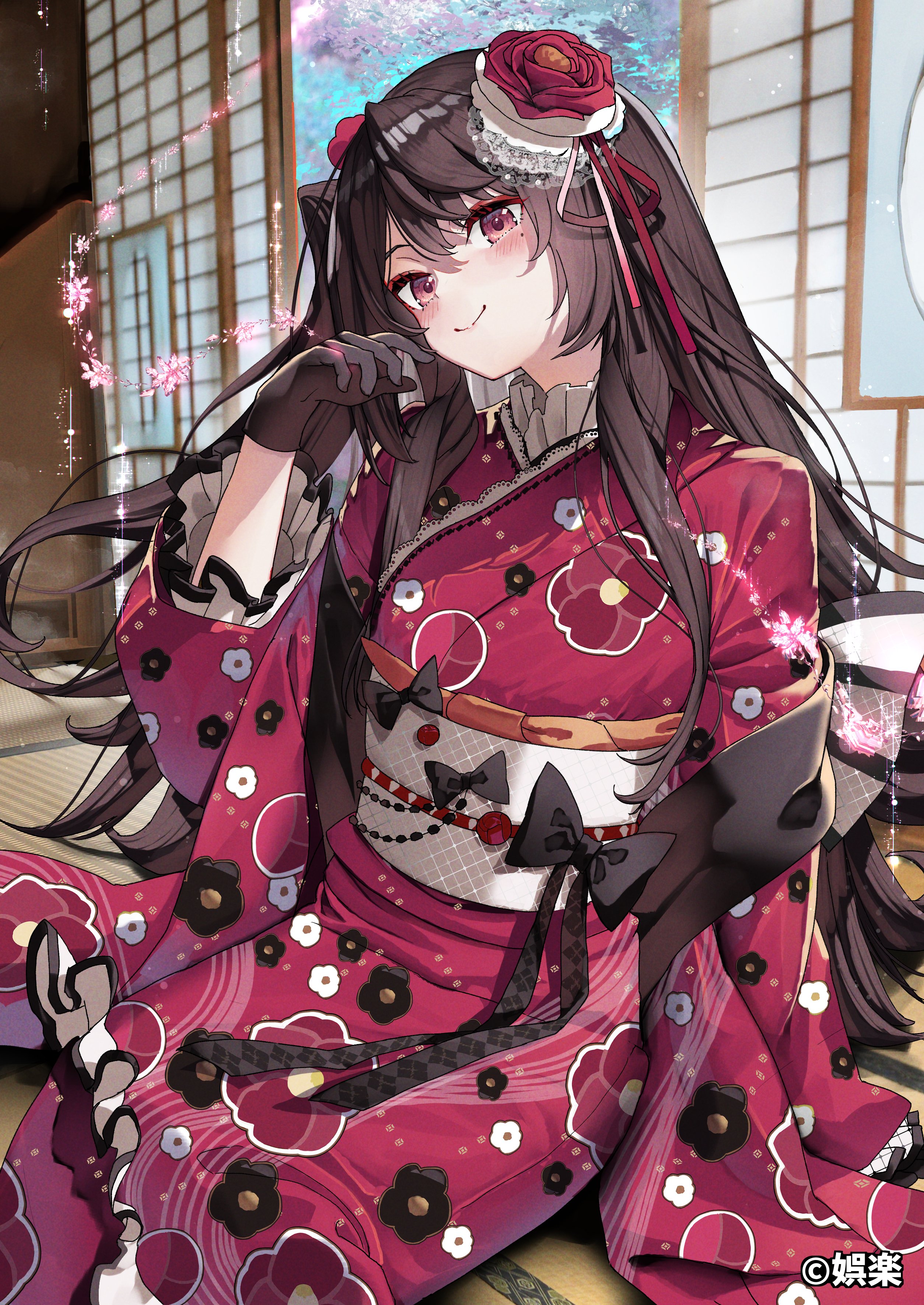 1girl absurdres black_bow black_gloves black_hair blush bow closed_mouth copyright_notice floral_print floral_print_kimono flower gloves goraku_production hair_flower hair_ornament hair_ribbon hand_up haruhina_purple highres indoors japanese_clothes kimono long_hair looking_at_viewer mole mole_under_eye obi ochinai_inaho print_kimono purple_eyes red_flower red_kimono red_ribbon red_rose ribbon rose sash shouji sitting sliding_doors smile solo tatami virtual_youtuber white_sash