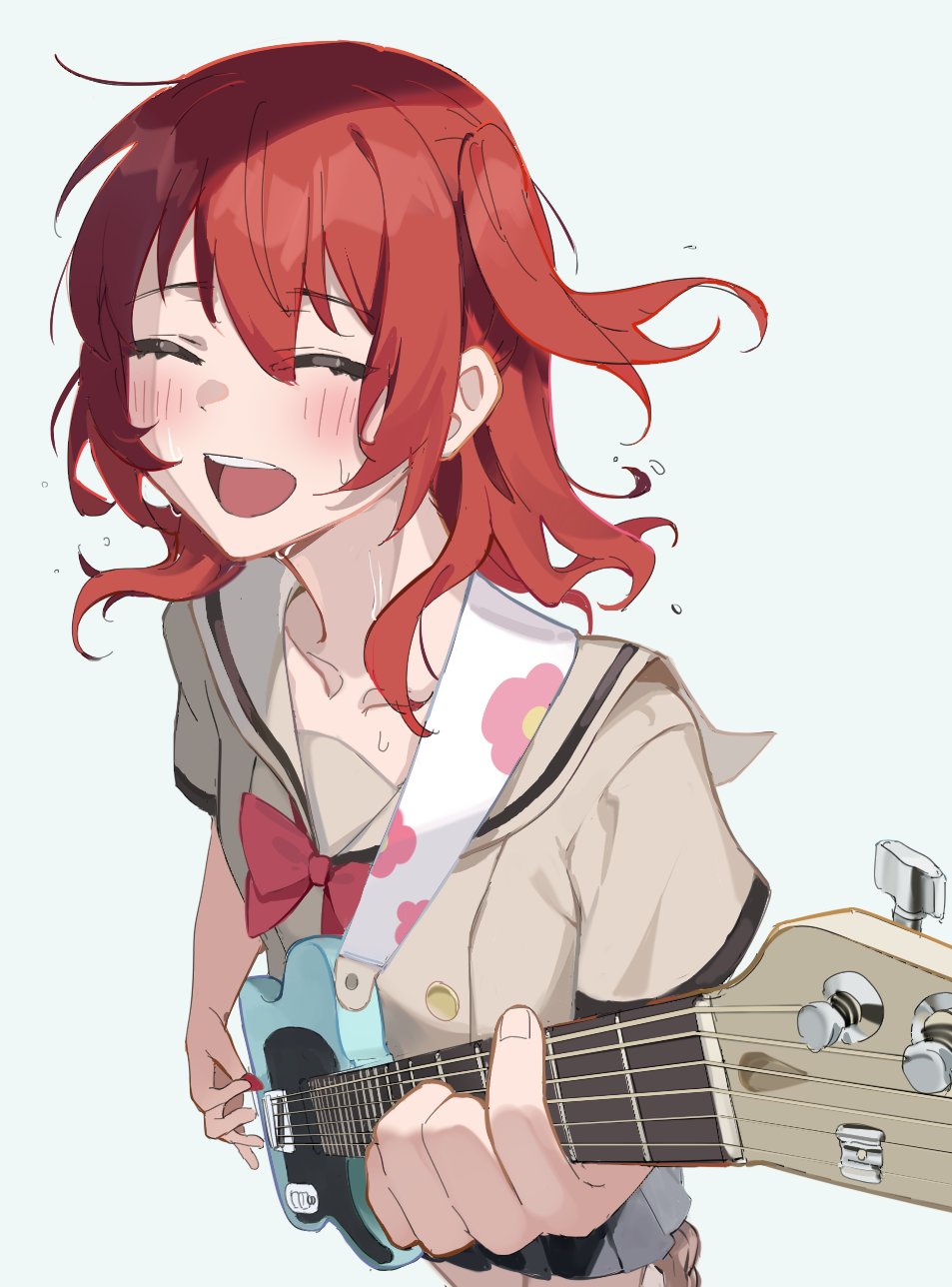 1girl bad_id bad_twitter_id black_skirt blush bocchi_the_rock! bow brown_jacket brown_shoes closed_eyes collarbone guitar guitar_strap hair_between_eyes highres holding holding_guitar holding_instrument holding_plectrum instrument jacket kita_ikuyo medium_hair music open_mouth playing_guitar playing_instrument pleated_skirt plectrum red_bow red_hair school_uniform shoes short_sleeves shuka_high_school_uniform sidelocks simple_background skirt solo sweat white_background yamiiv