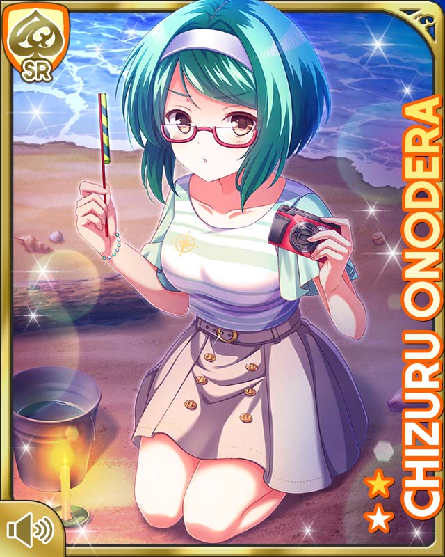 1girl :o beach brown_eyes card_(medium) collarbone dress fireworks girlfriend_(kari) glasses green_hair grey_dress headband kneeling night official_art onodera_chizuru open_mouth outdoors qp:flapper red-framed_eyewear shirt short_hair solo striped_clothes white_headband white_shirt